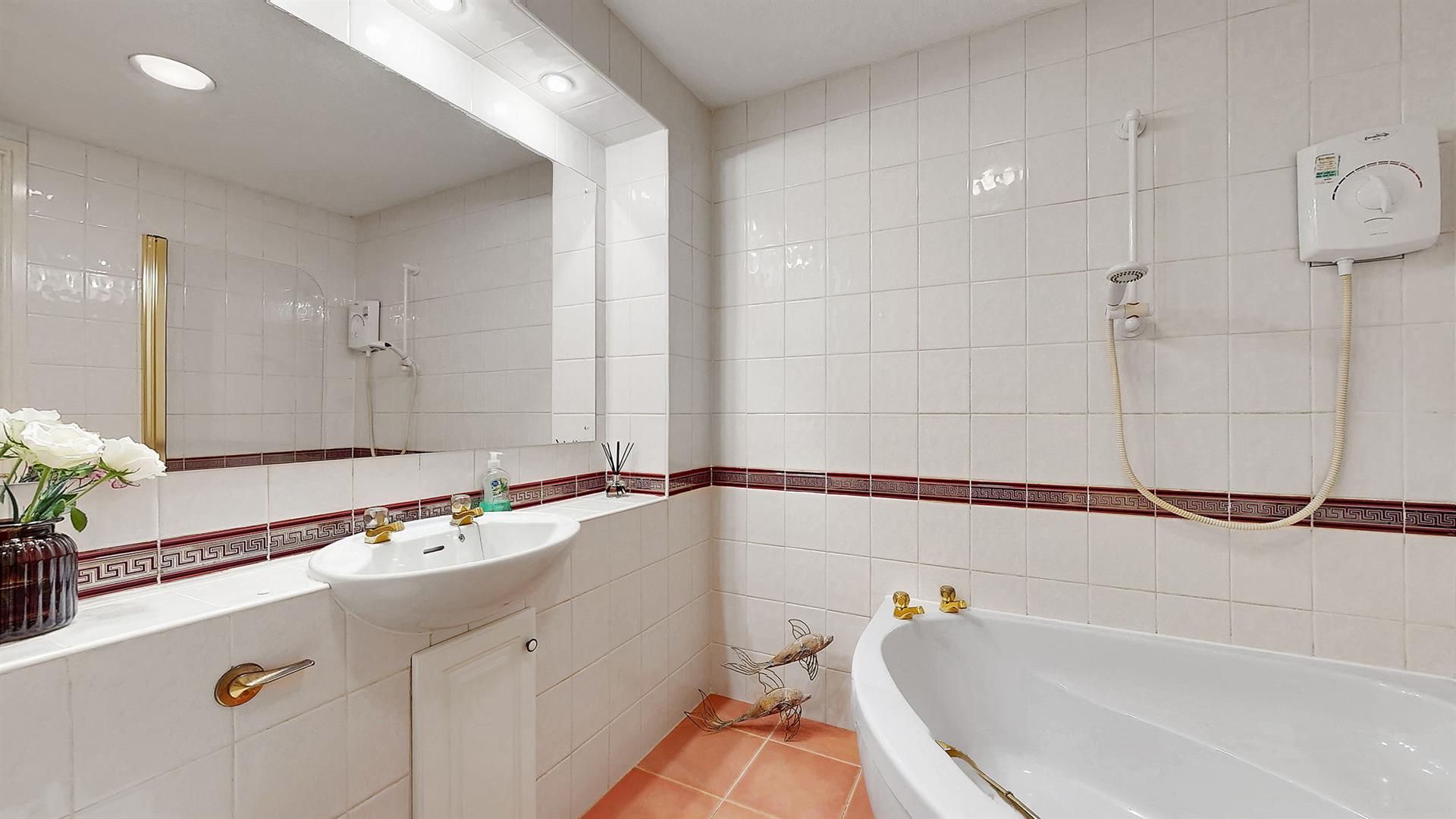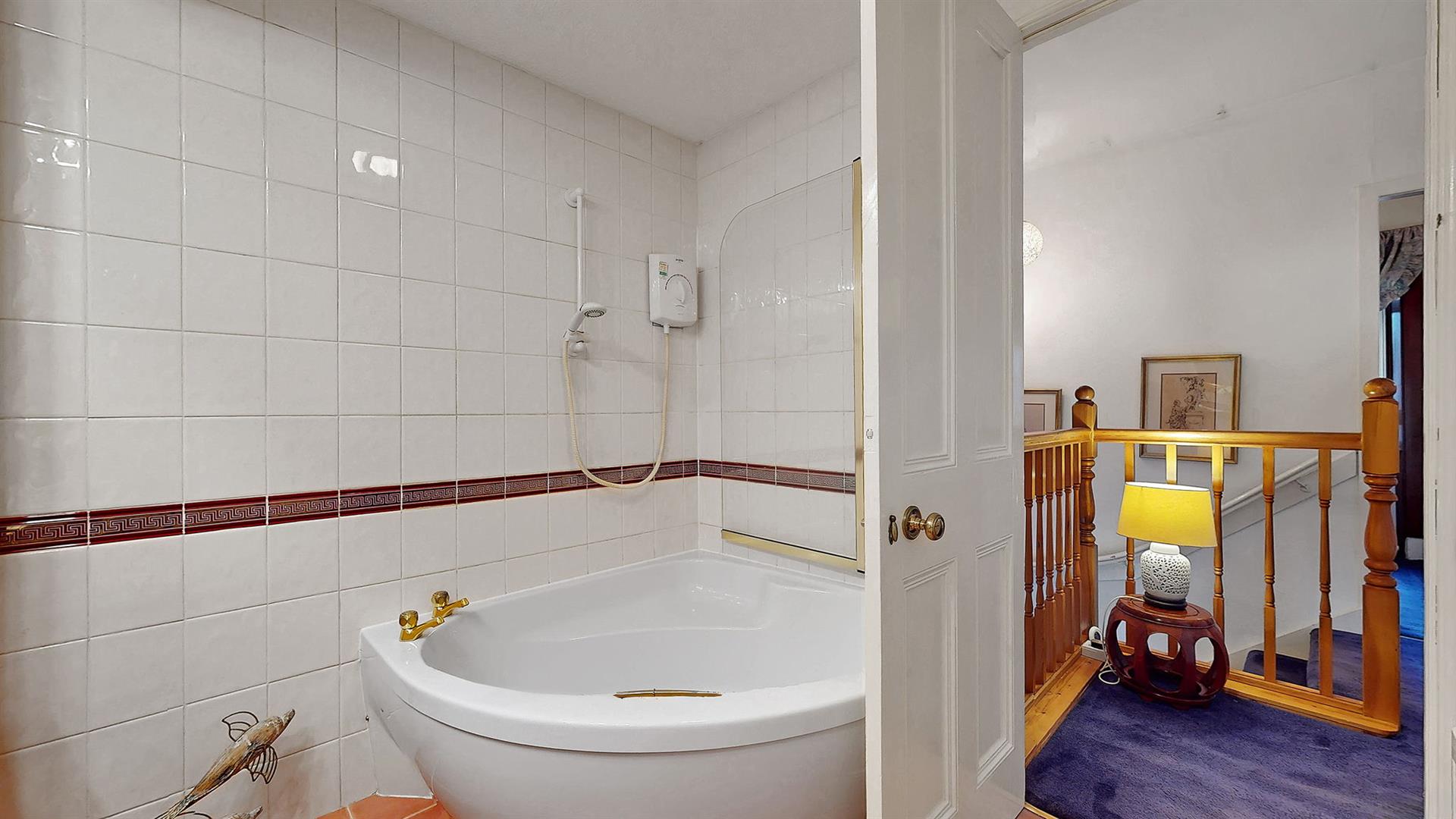On the upper level, the property boasts three well-proportioned bedrooms, all offering excellent space and additional storage. The family bathroom completes the accommodation and comprises a corner bathtub with overhead electric shower, wash-hand basin and W.C.
