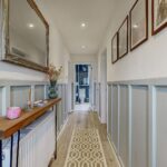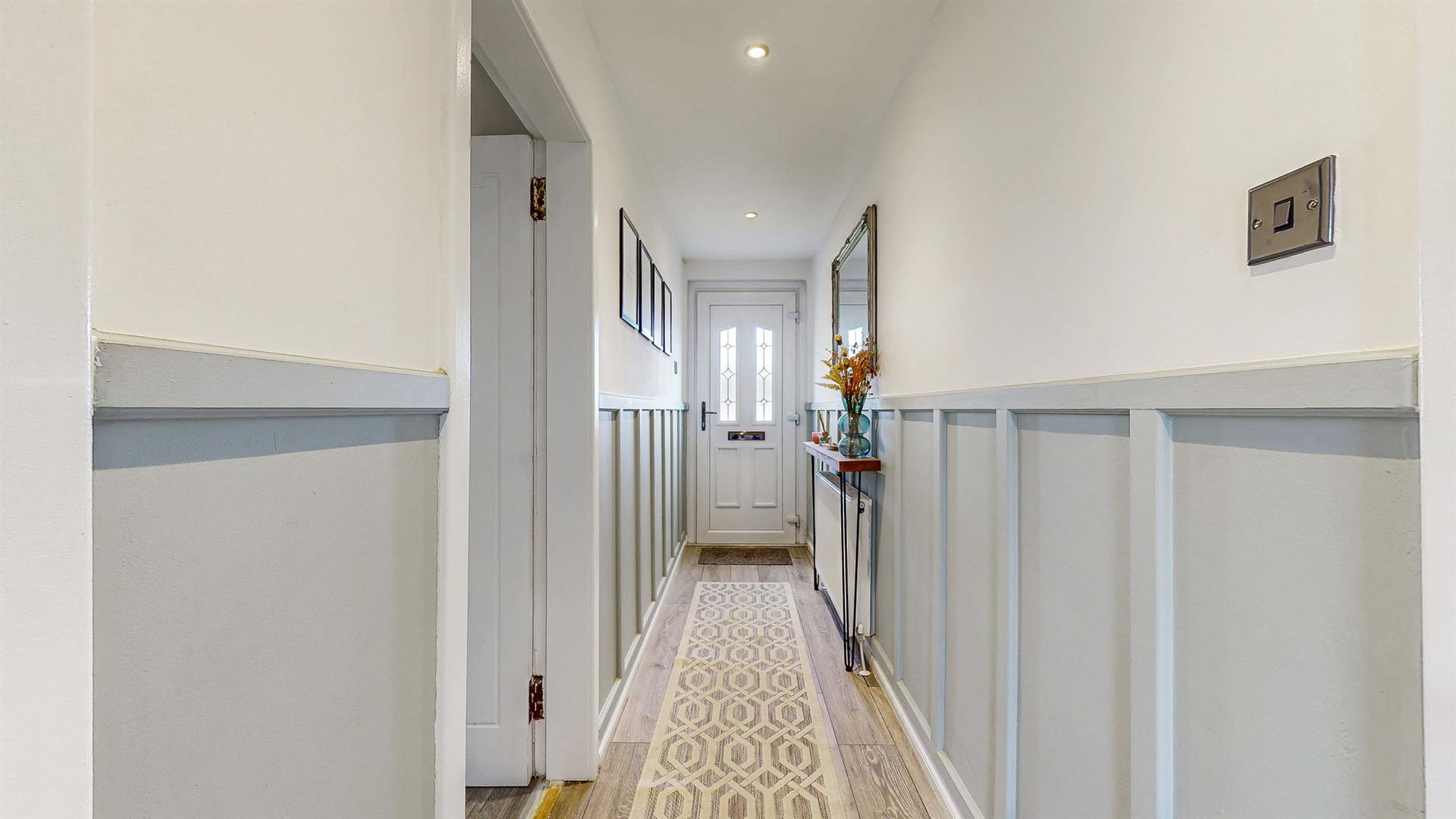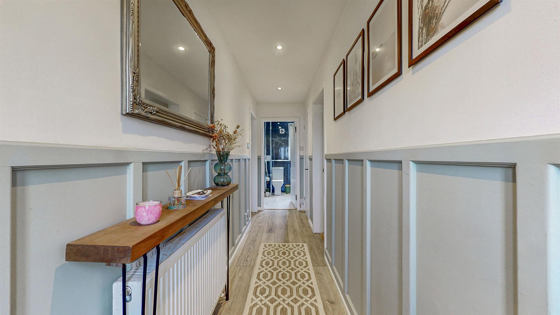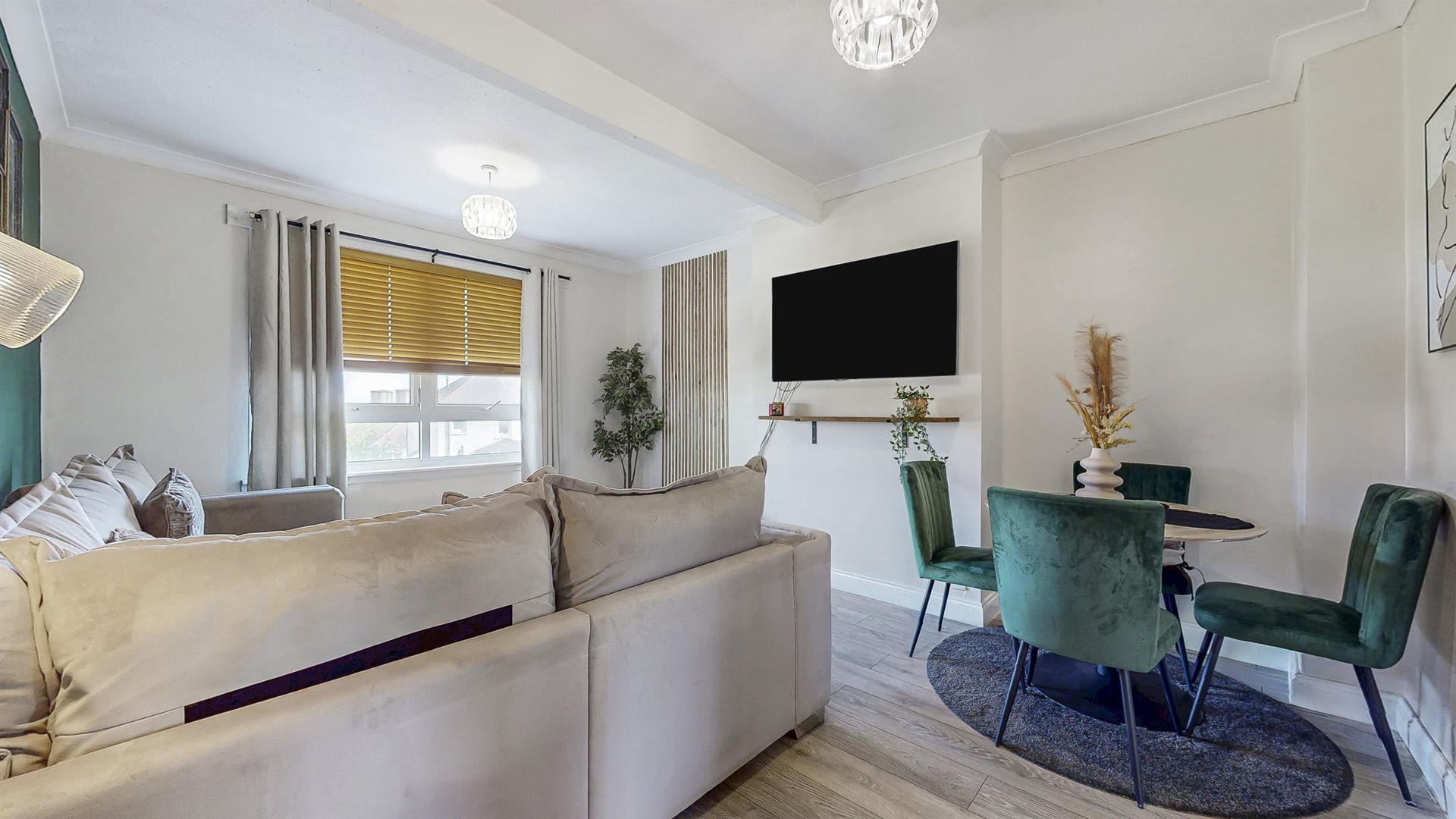To the front, the property benefits from ample on street parking and a low maintenance garden with lawn and patio seating area. On entrance, the welcoming hallway boasts feature panelling and a large storage cupboard. The neutrally decorated lounge benefits from large windows filling this space with an abundance of natural sunlight and a compact dining space. The modern fitted kitchen has an array of white wall and base mounted units paired with wood effect worktops, creating a clean and efficient workspace. The kitchen further benefits from an integrated gas hob, oven, extractor fan and fridge-freezer. Additional space is available for a free-standing dishwasher.