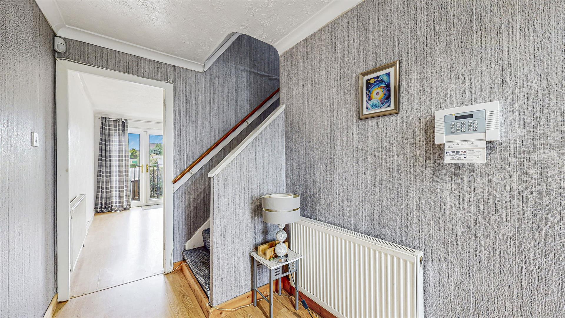 To the front, the property benefits from ample on street parking and a low maintenance lawn garden. Upon entering, an entrance vestibule is immediately available which leads to a secondary alarmed door, providing additional security. The welcoming reception hallway offers access to all rooms and boasts good storage facilities. The lounge is space and bright with an abundance of natural light filling this room. French doors provide access from the lounge to the rear garden which is the perfect little spot to relax and enjoy some nice weather. The modern fitted kitchen hosts an array of white wall and base mounted units paired with complementing worktops, creating a fashionable and efficient workspace. The kitchen also boasts an integrated oven, hob and extractor fan and adequate space for free standing fridge-freezer, washing machine and dishwasher. On the upper level are two generously proportioned bedrooms, one of which boasts fitted storage. Completing this property is a commodious family bathroom, comprising of an electric shower over bath, wash hand basin and W.C. The apartment also benefits from gas central heating and double glazing throughout, providing all rooms with a lovely warmth all year round.