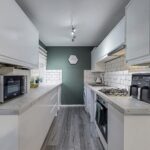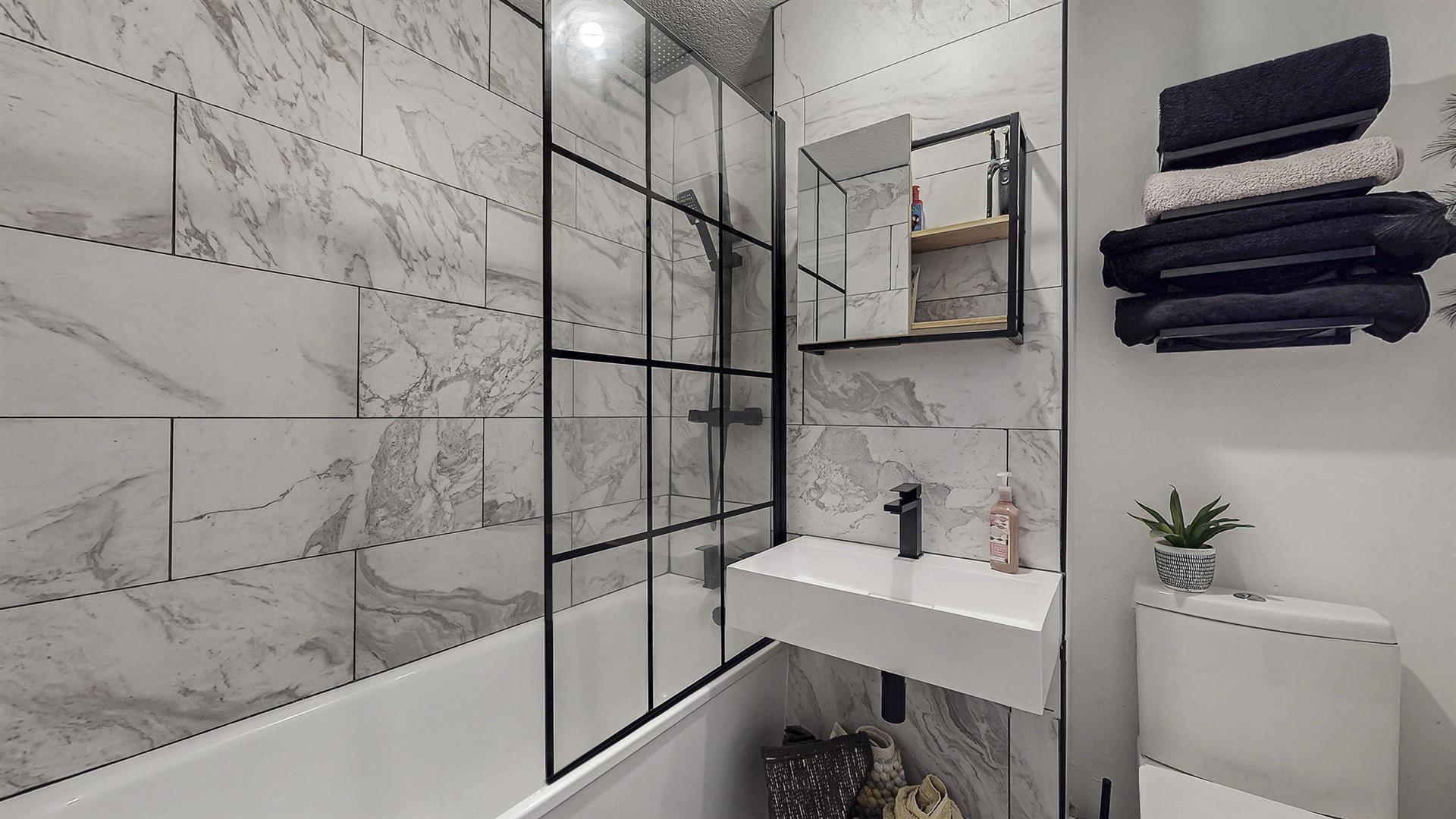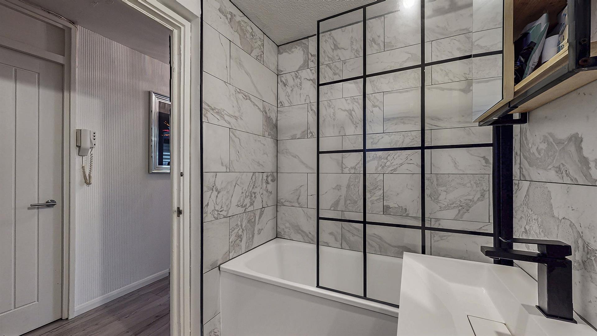 On entrance, you are welcomed into the reception hallway which leads to the bright and spacious open-plan lounge and kitchen. The lounge benefits from a feature media wall and dual aspect windows which fill this room with an abundance of natural light. The modern fitted kitchen is located off the lounge and hosts an integrated gas hob, oven and extractor fan. Ample space is available for any required free-standing kitchen appliances. The double bedroom is generously proportioned and boasts a large walk-in closet providing excellent storage space. Additional storage cupboards are also available within the hallway. The modern fitted bathroom has been beautifully designed with black accents and comprises of a bathtub with rainfall shower, wash-hand basin and W.C. The apartment also benefits from gas central heating and double glazing throughout, providing all rooms with a lovely warmth all year round.