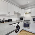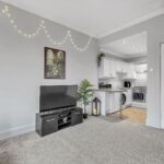 On entrance, you are welcomed into the reception hallway which leads to the bright open-plan lounge and kitchen. This room benefits from a large bay window which fills this space with an abundance of natural light and provides a scenic view. The modern fitted kitchen is located off the lounge and hosts an integrated hob, oven and extractor fan. Ample space is available for any required free-standing kitchen appliances.