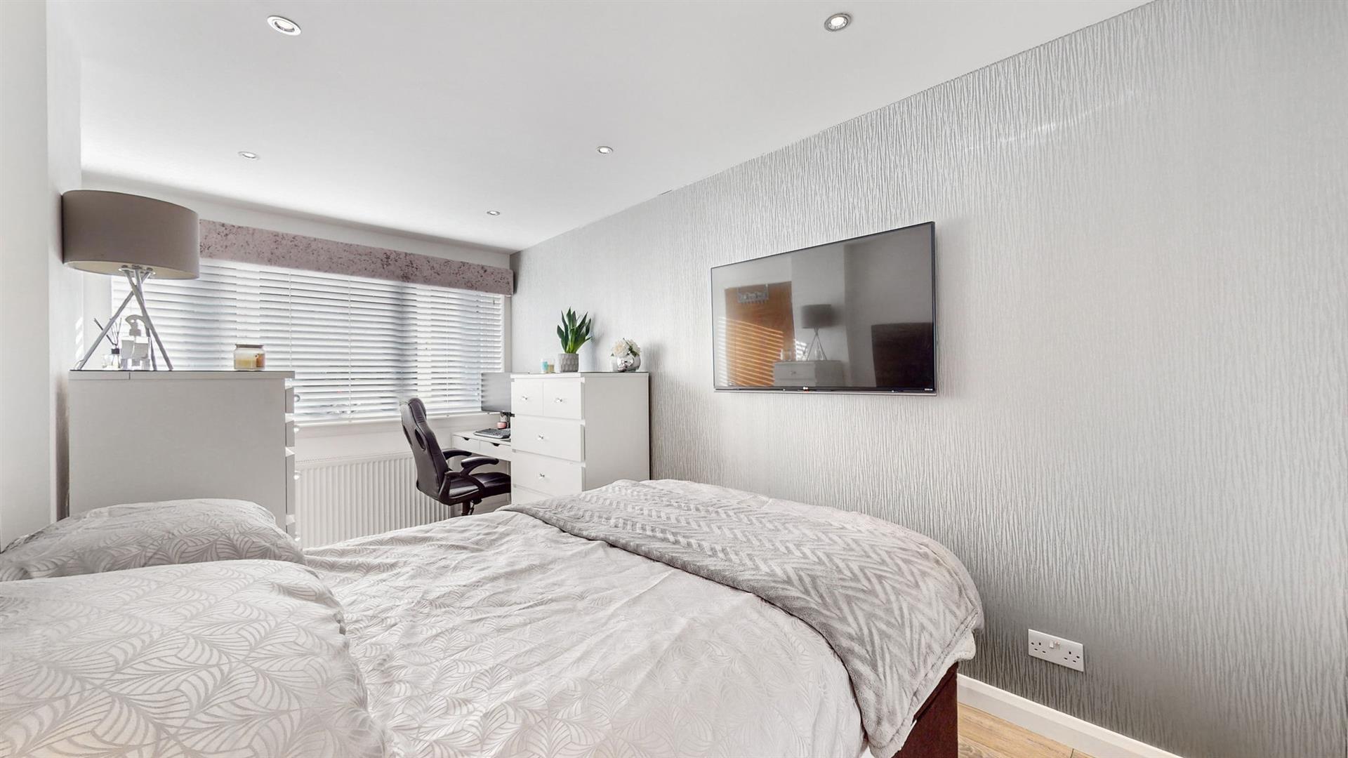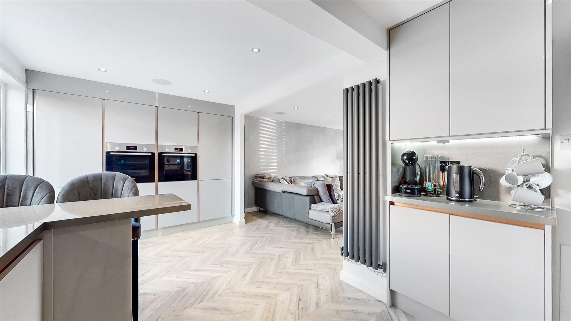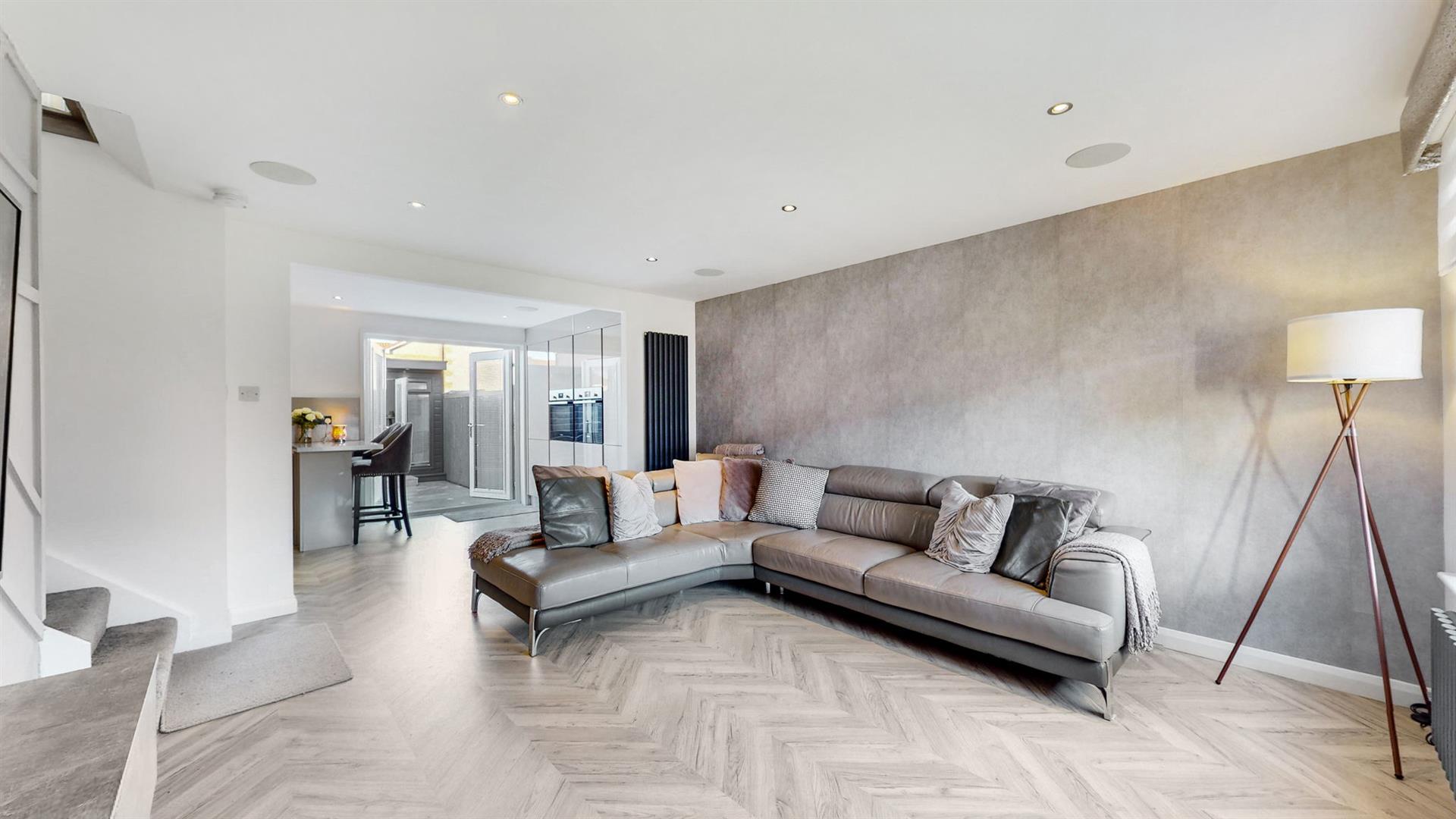 To the front, the property benefits from a two-car driveway and easily maintained lawn garden area. The welcoming reception hallway leads firstly to the beautiful lounge area which boasts surround sound speakers in ceiling. With open plan access to the kitchen and dining area, this is a truly fantastic space for relaxation and enjoying family time. The modern fitted kitchen is sleek in design with an array of high-gloss wall and base mounted units paired with complementing worktops, creating a fashionable and efficient workspace. The kitchen further benefits from a range of quality integrated appliances to include a dishwasher, washing machine, fridge freezer, gas hob, and an eye level oven and grill. Also situated on the ground level is a well-proportioned double bedroom with excellent fitted storage. This space is flexible for a variety of uses and could also be utilised as home office, playroom etc. Completing this floor, is a stunning ground floor shower room, comprising of a walk-in shower cubicle with electric shower, vanity unit and W.C.