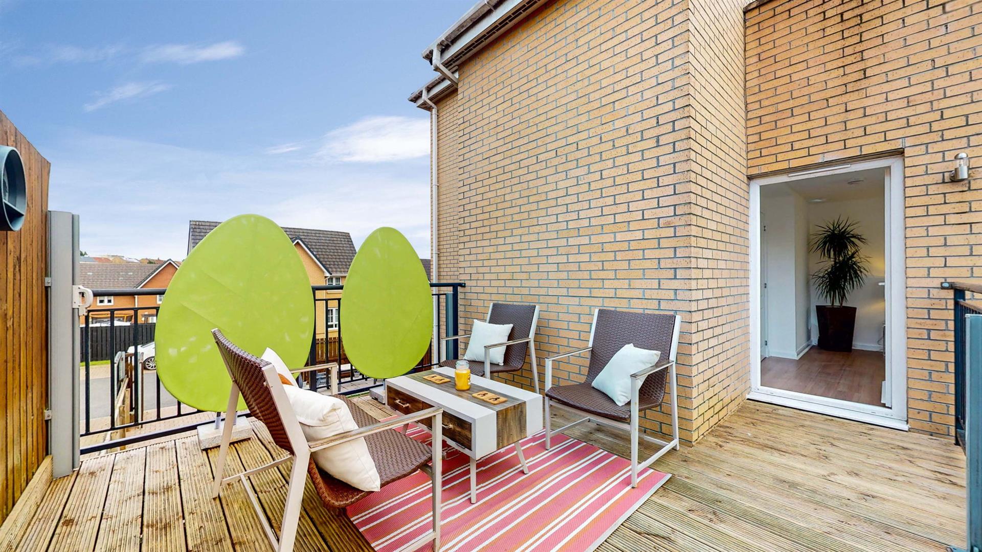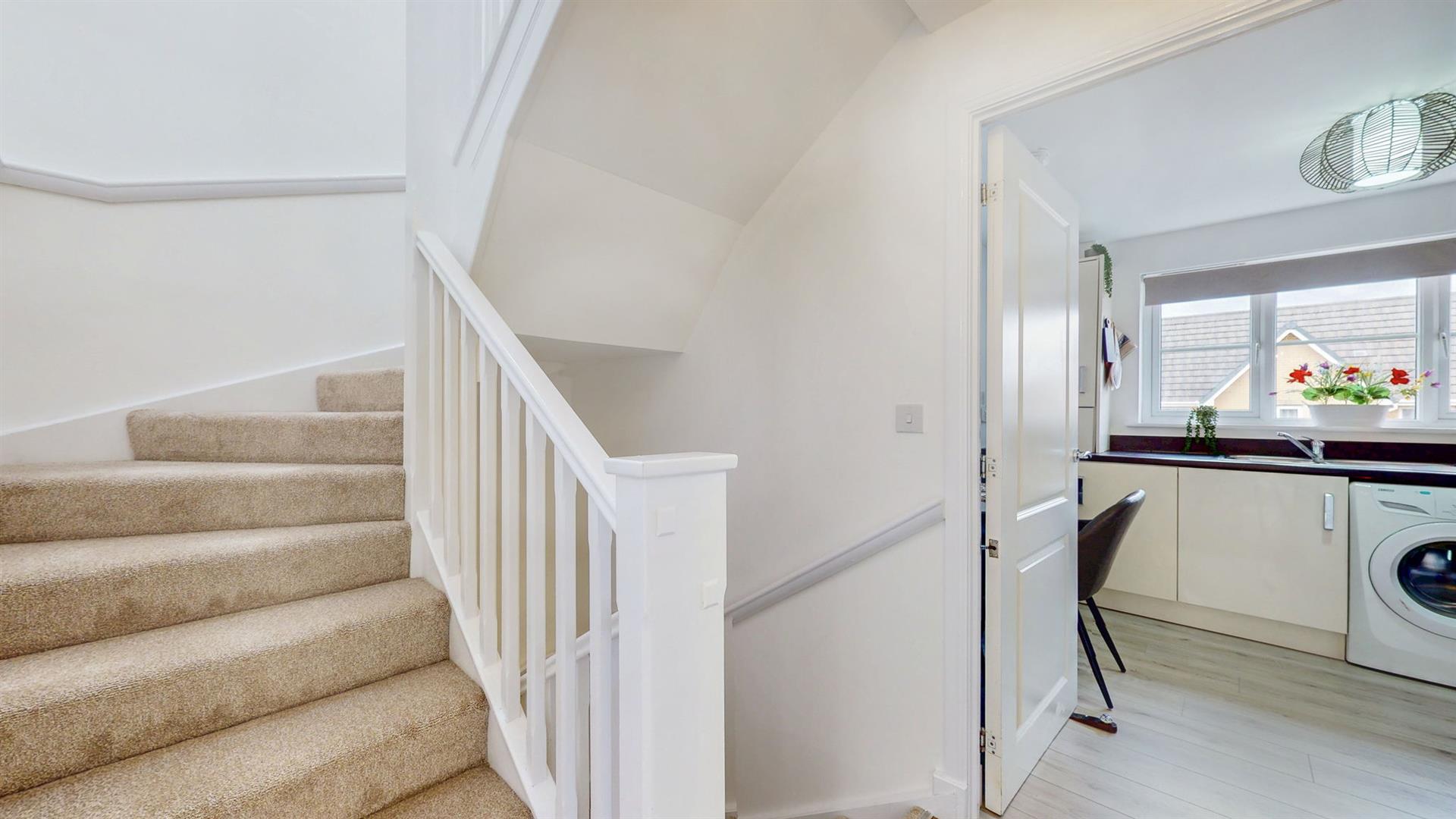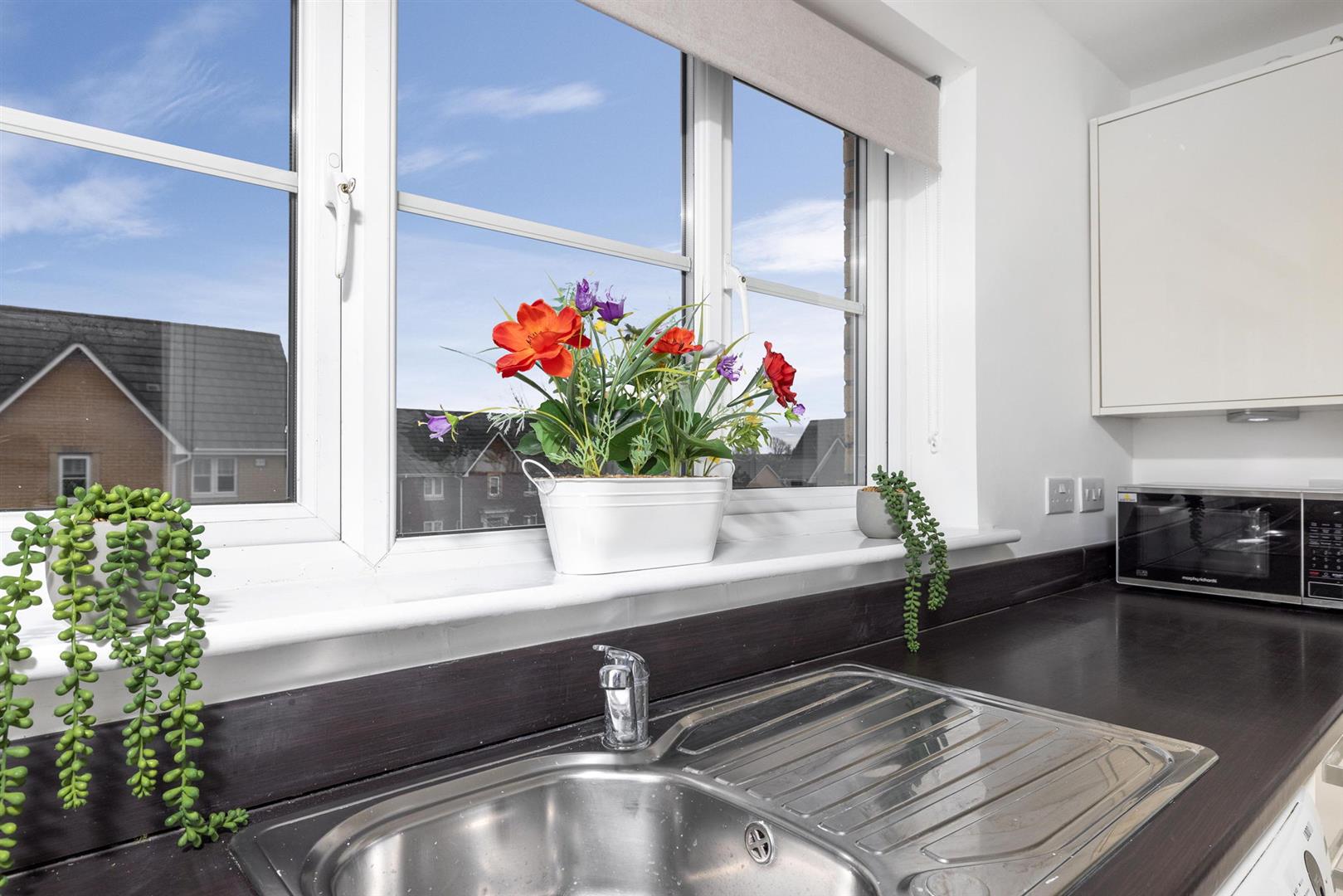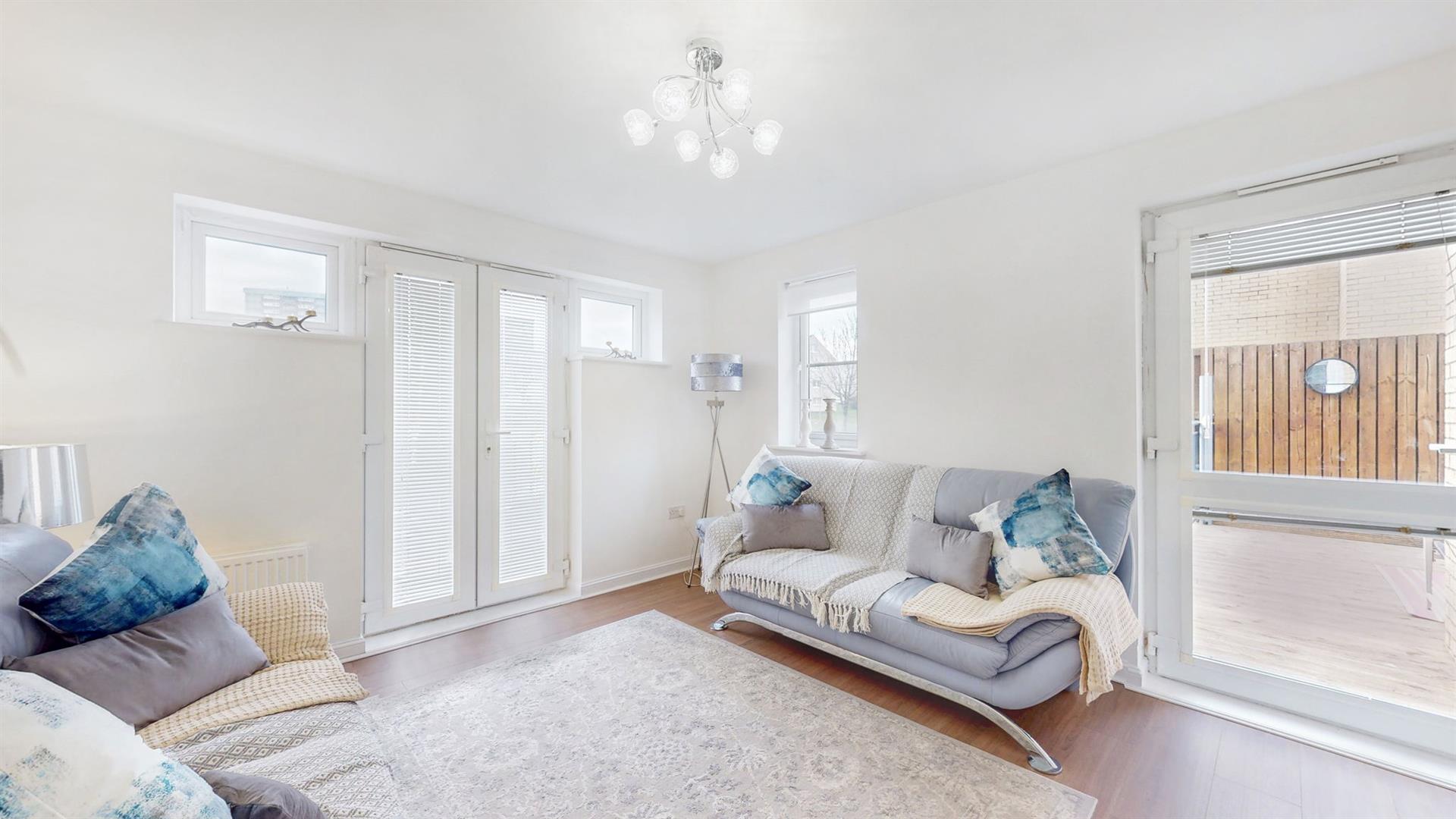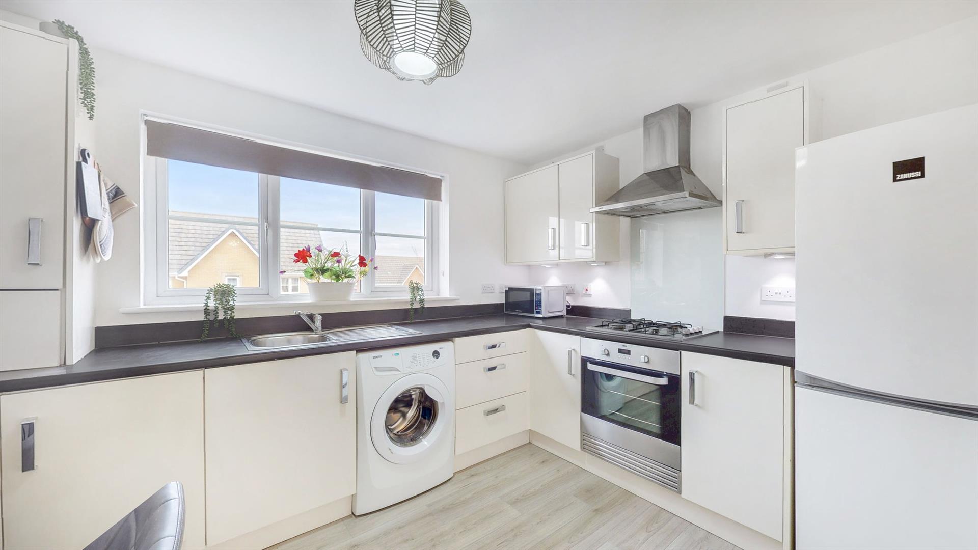 A carpeted staircase leads to the accommodation on the first floor and firstly to the spacious lounge. A Juliette balcony and terrace with outdoor seating area just off the lounge creates a bright and open feel to this space. The modern fitted kitchen hosts an array of cream wall and floor units and integrated gas hob, oven and extractor fan. Ample space is available for a compact dining table and a free-standing washing machine and fridge-freezer. A shower room with walk-in shower cubicle, wash hand basin and W.C completes this floor.