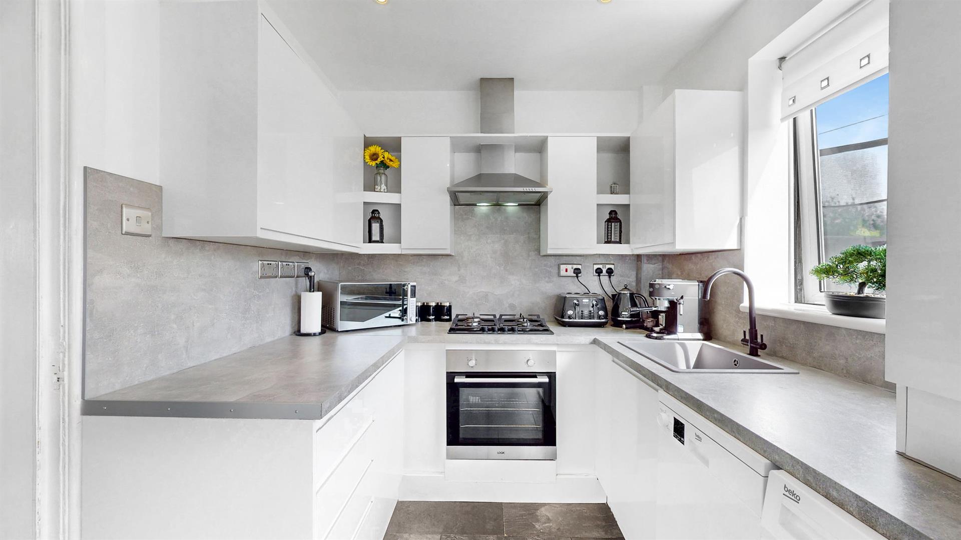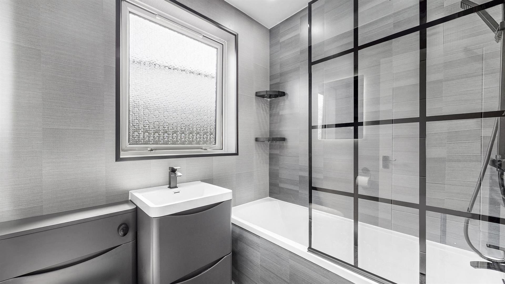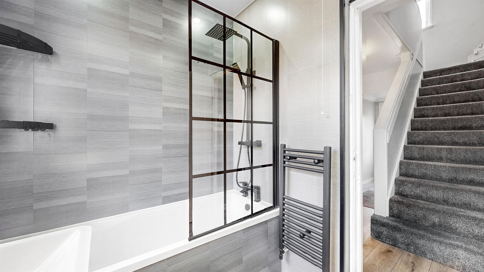 The modern fitted kitchen boasts an array of gloss wall and base units and ample workspace. The kitchen further benefits from an integrated gas hob, oven and extractor fan. Ample space is available for a free-standing washing machine, dishwasher and fridge freezer. Access to the splendid, south facing rear garden is also via the kitchen. Completing this floor is a newly fitted family bathroom, designed to a high specification with quality fixtures and fittings, comprising of a bathtub with rainfall shower over, vanity unit and W.C.