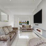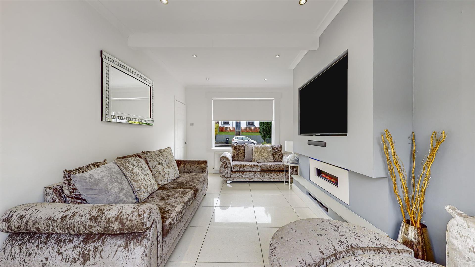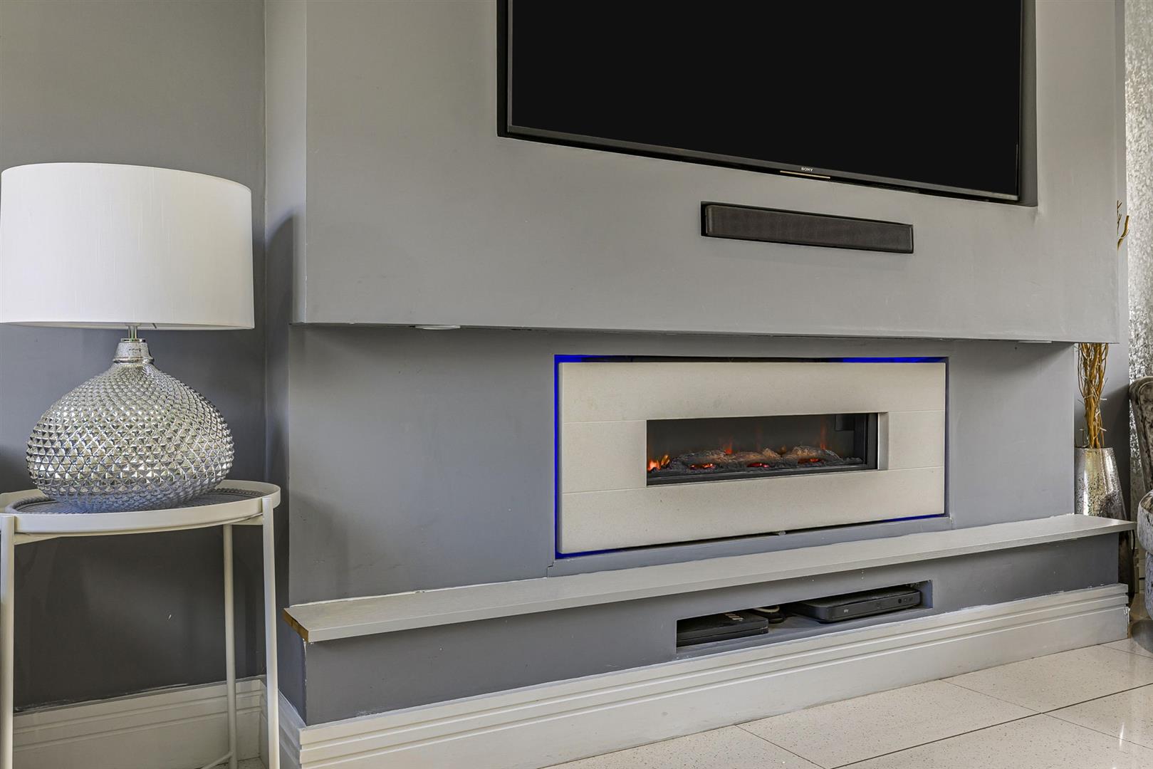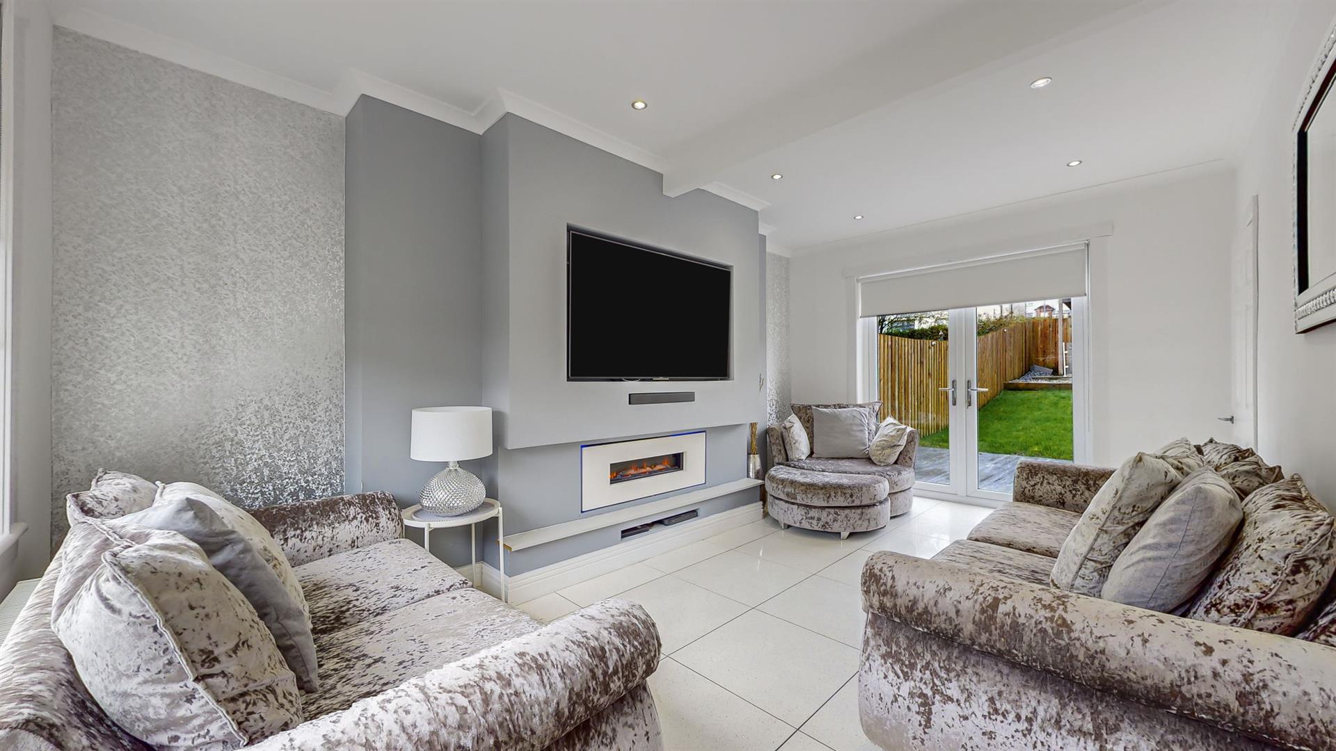 To the front, the property benefits from an easily maintained lawn garden, driveway and additional on street parking. Upon entering through the modern UPVC door, you are welcomed in through to the reception hallway which leads you in the first instance to the lounge. The neutrally decorated family lounge boasts under floor heating, a feature media wall with inset fire. With large windows and patio doors leading to the garden at opposing ends of this room, the space is filled with natural sunlight.