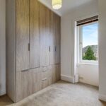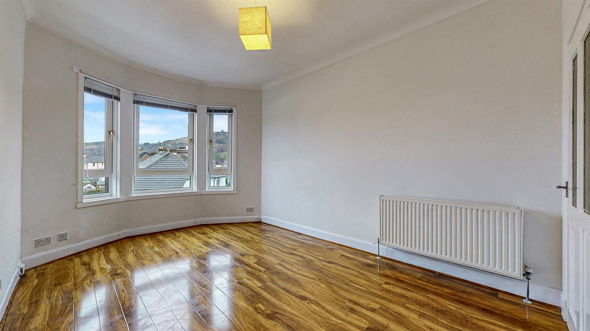 On entrance, you are welcomed into the reception hallway which leads to the bright and spacious lounge. This room benefits high-gloss flooring and a large bay window which fills this space with an abundance of natural light and provides a stunning view overlooking the Kilpatrick Hills. The galley-style kitchen hosts an array of units and workspace, providing a clean and efficient workspace. Integrated appliances include a gas hob, oven, microwave, extractor fan and fridge-freezer with space available for a free-standing washing machine.