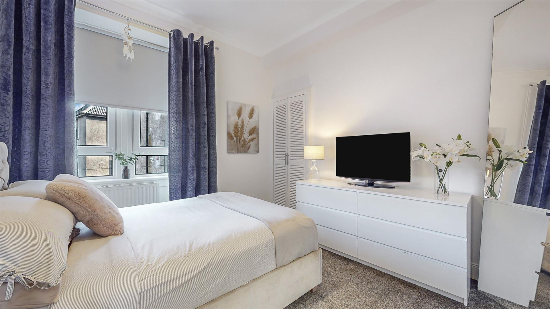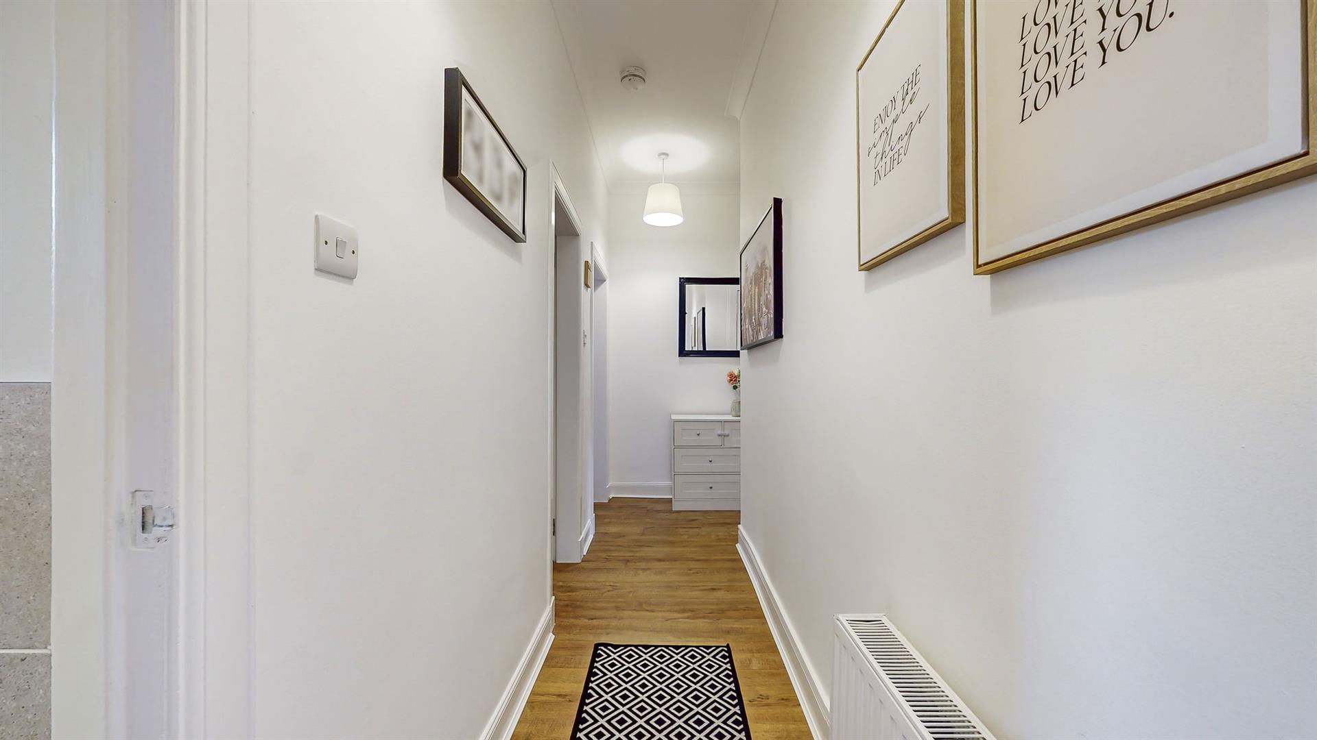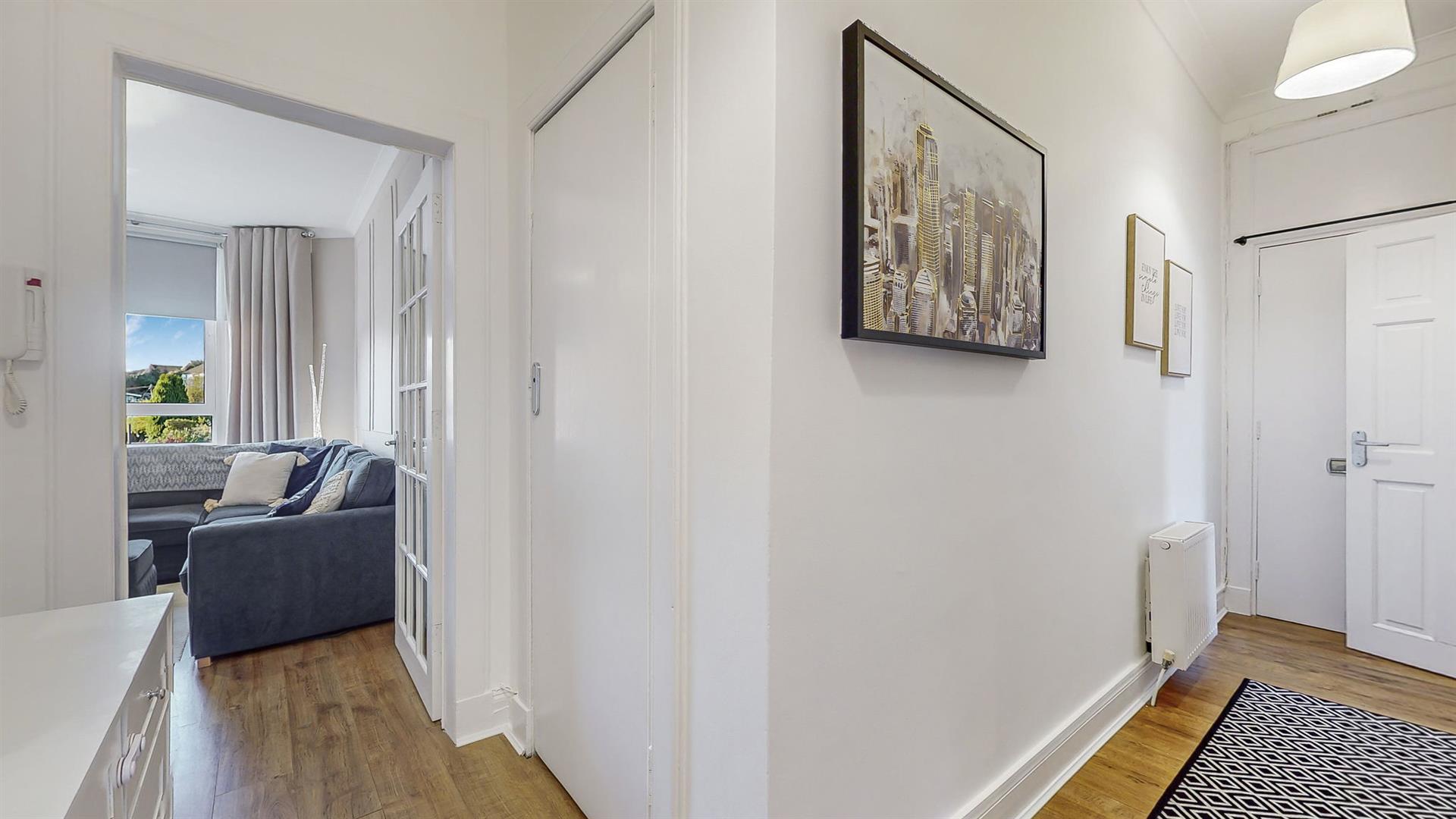 Both bedrooms are well proportioned and boast large windows, creating a bright and relaxing spaces. The galley styled bathroom comprises of a bathtub, vanity unit, W.C. and electric shower over the bath. Within the spacious hallway, a large cupboard is available providing additional storage. The apartment also benefits from gas central heating (New boiler fitted October 2024) and double glazing throughout, providing all rooms with a lovely warmth all year round.