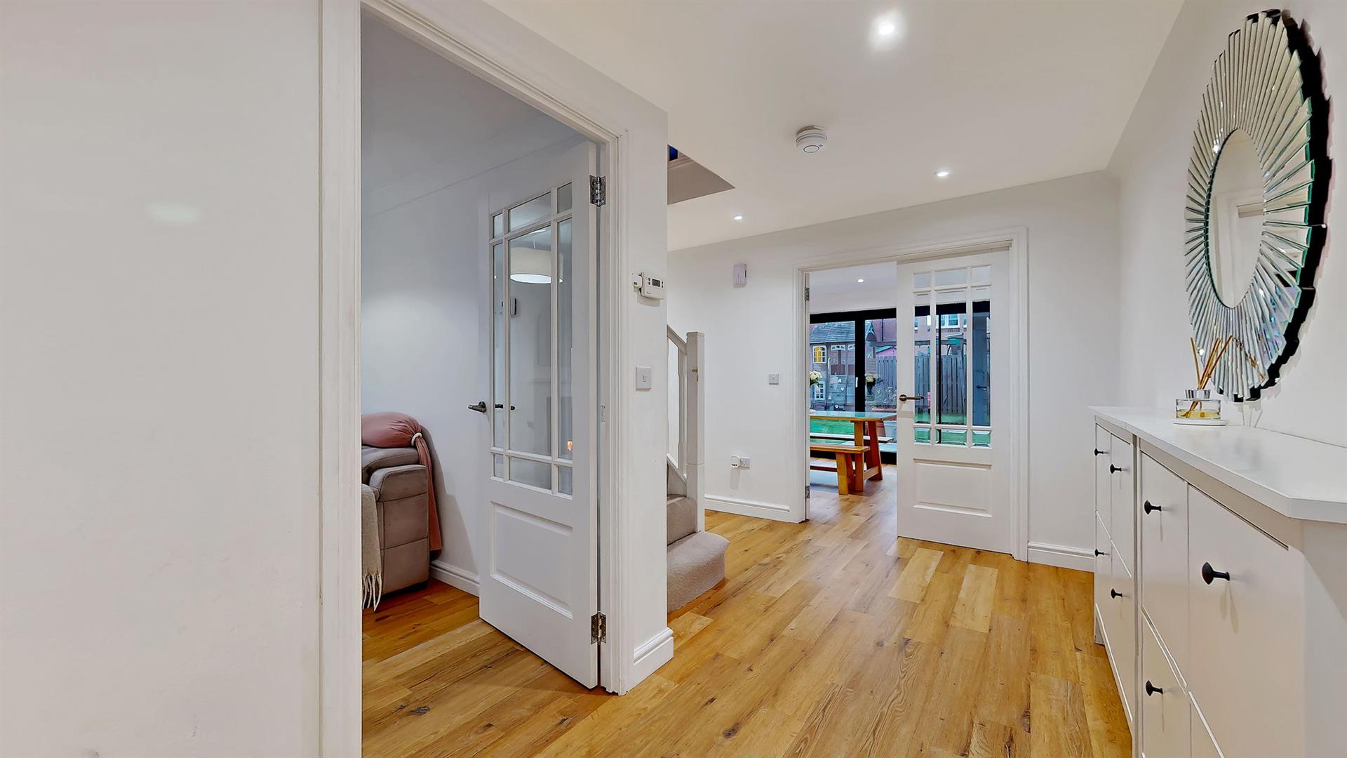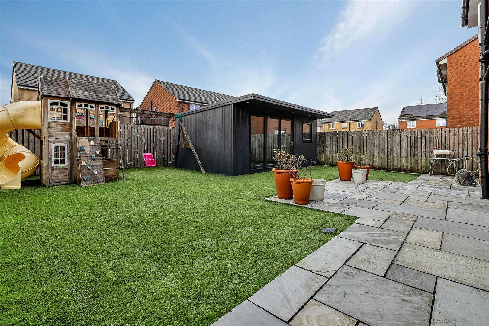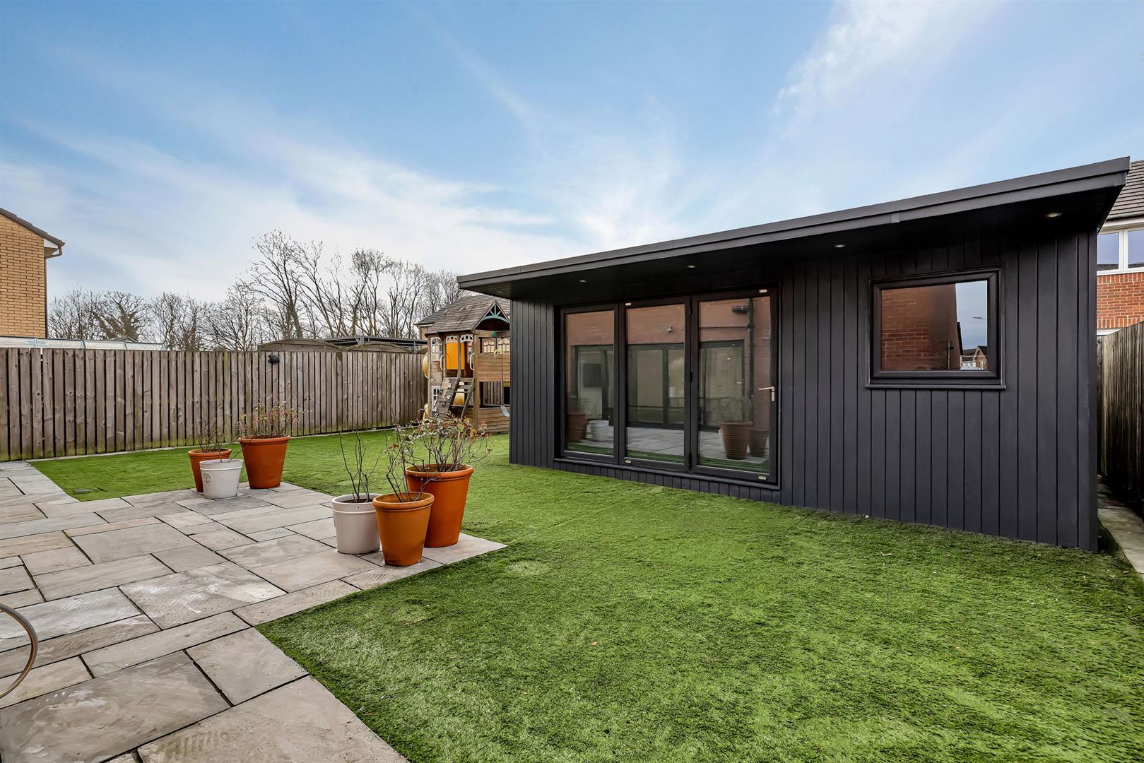 Access to the beautifully landscaped rear garden is available via Bi-Fold doors from the dining room. The garden is fully enclosed providing a safe space for children and pets alike and features a superb summerhouse, flexible for a variety of uses, such as home office, gym or a family games room. This area boasts both artificial lawn and patio areas, providing a low-maintenance space, perfect for enjoying the outdoors, summer barbecues and al-fresco dining.