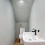 Upon entering, you are welcomed into the bright and spacious hallway which leads firstly into the lounge. This beautifully decorated space is impressive in size and boasts solid wood flooring and large windows which fill this space with an abundance of natural sunlight. The contemporary fitted kitchen is situated to the rear of the lounge and benefits from an array of navy wall and base units paired with quartz worktop and upriser, creating a sleek and modern space. The kitchen further benefits from recently fitted appliances, including an integrated fridge freezer, oven, hob, extractor fan and free-standing washing machine. Completing this floor is a cloakroom conveniently located under the stairwell which comprises of a wash hand basin and W.C.