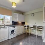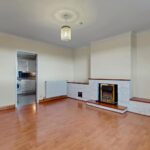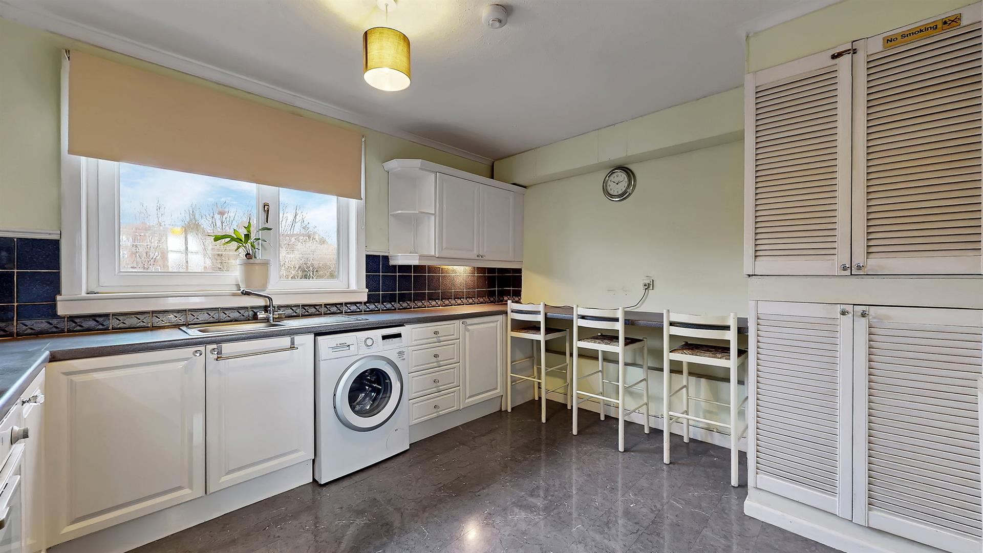 The lounge features a charming fireplace and a large window, allowing for an abundance of natural light. The fitted kitchen offers a range of wall and base units with coordinating laminate worktops, creating a clean and practical workspace. A breakfast bar seating area sits at the end of the kitchen, ideal for both busy families and professionals. The kitchen also benefits from an integrated electric hob, oven, and extractor fan, with additional space for free-standing appliances.