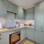 The beautifully decorated lounge boasts two large windows, filling this space with an abundance of natural sunlight. The modern, newly fitted kitchen hosts an array of stylish, sage-green wall and base mounted units and complementing worktops, creating a clean and efficient workspace. The kitchen further benefits from an integrated electric hob, oven, extractor fan and fridge-freezer. Space has also been allocated for a free-standing washing machine.