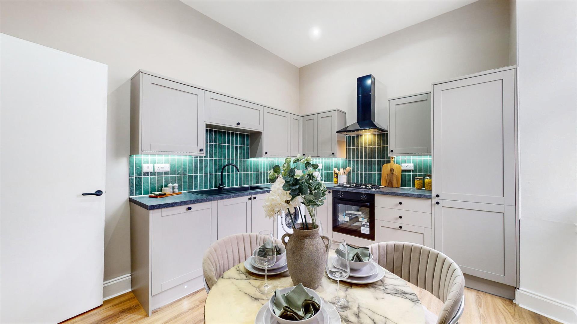 Upon entering through the entrance vestibule, you are welcomed into the bright and airy reception hallway which leads to all rooms within this beautiful property and boasts excellent storage options. Intricate cornicing has been beautifully restored within the hallway, creating a grand feel to this reception space. The neutrally decorated lounge is generous in size and boasts a feature fireplace, impressive ceiling heights and a large bay window filling this space with an abundance of natural light. The newly fitted kitchen hosts an array of light grey wall and floor units and co-ordinating worktops, creating a clean and efficient workspace. New kitchen appliances include an integrated fridge-freezer, oven, hob, extractor fan and free-standing washing machine. Ample space is also available for dining.