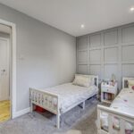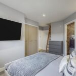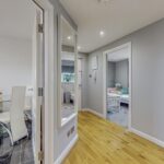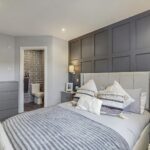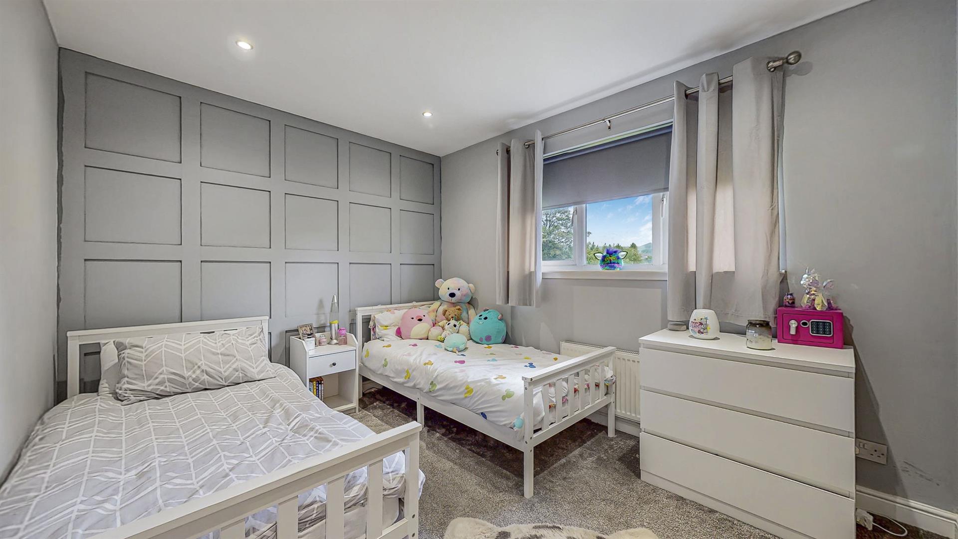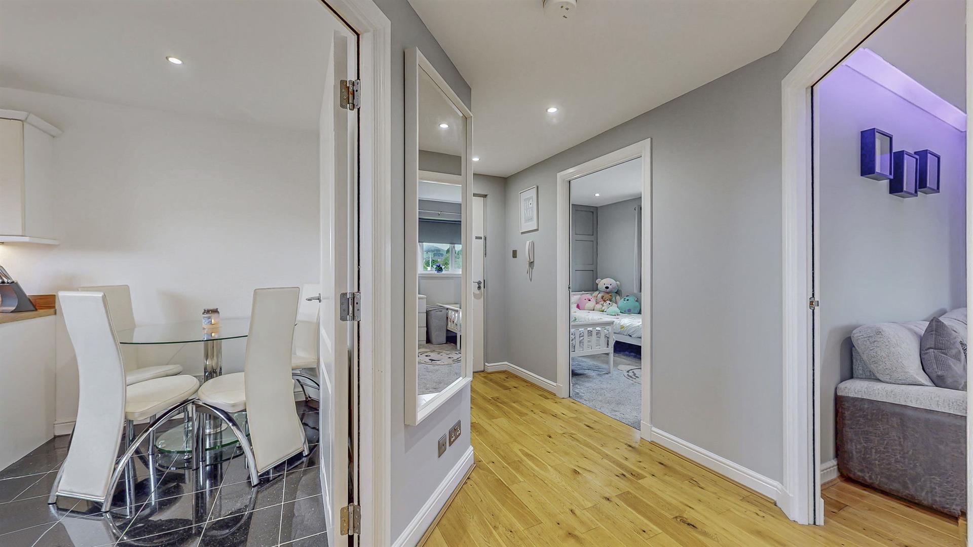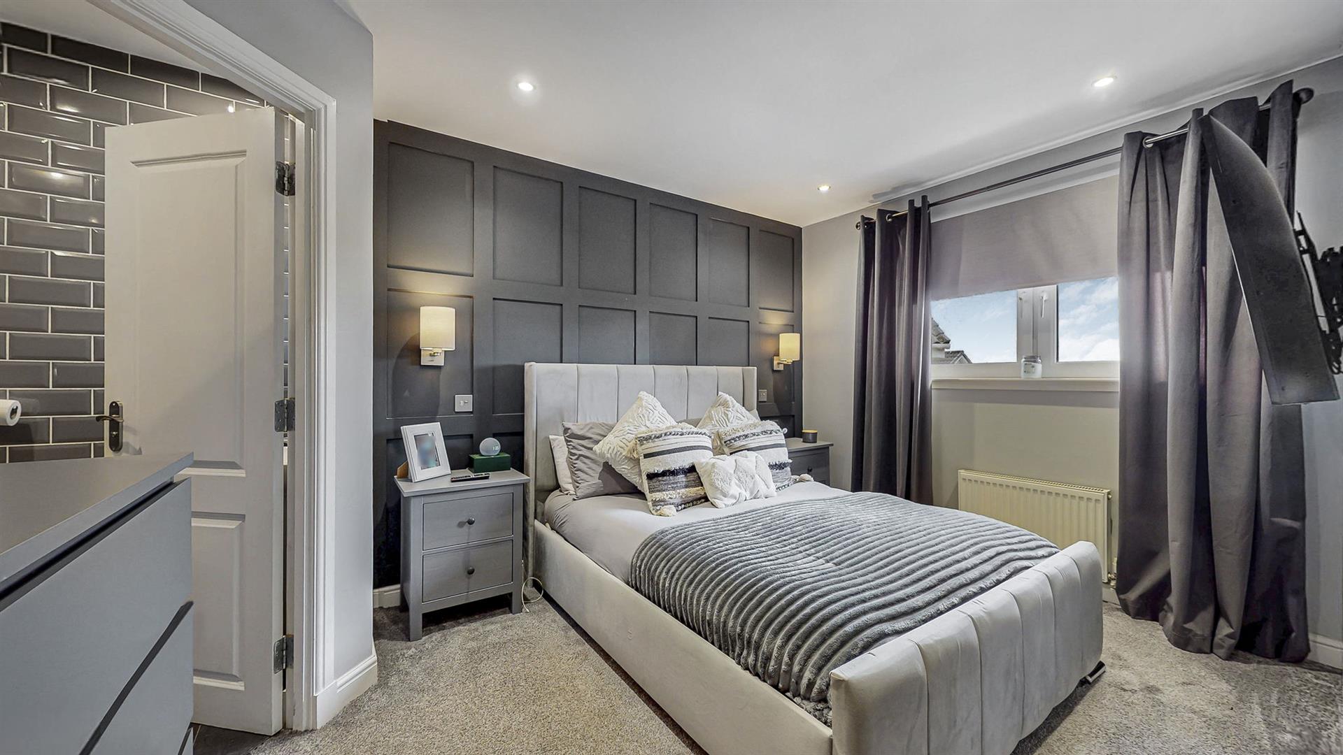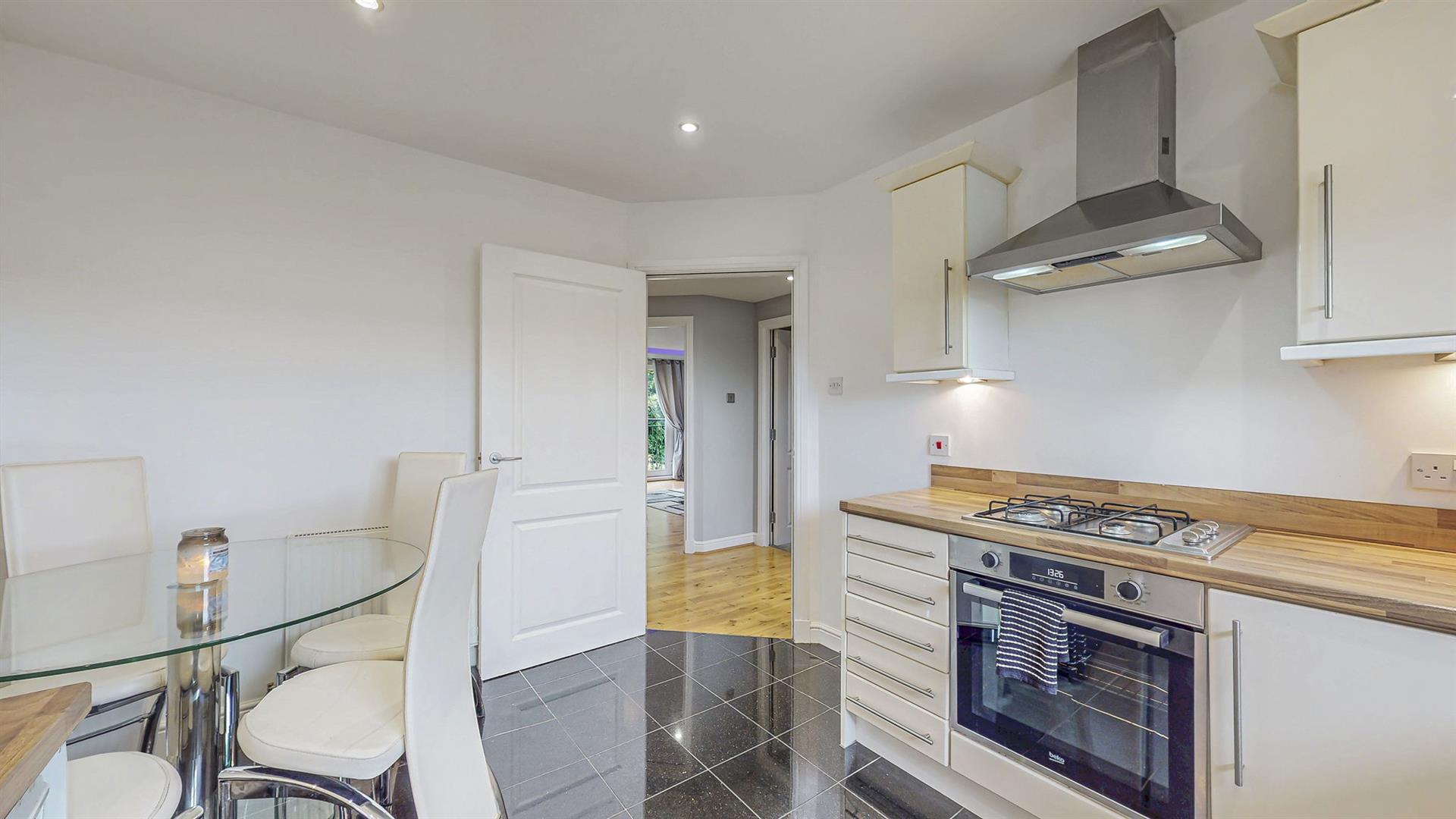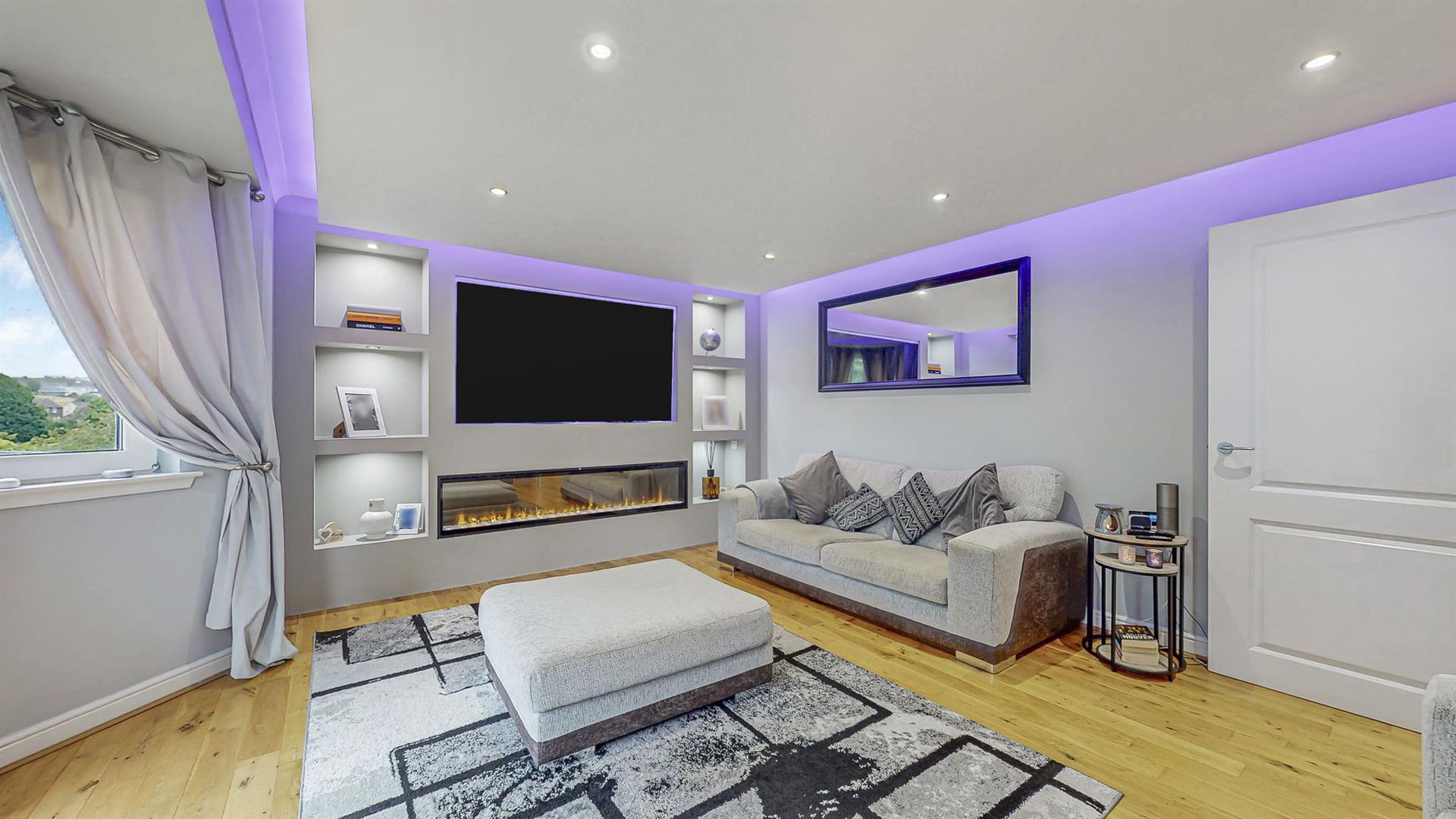 Upon entering into the property, you are welcomed into the bright and airy reception hallway which leads to all rooms. Quality wood flooring extends from the hallway into the lounge area. Modern spotlights have been fitted throughout the property, some of which are smart controlled allowing you to remotely control colours and brightness. The lounge is generous in size and boasts a feature media wall with ambient lighting, inset fire, modern shelving and space for a 75 inch television. A large bay window with a Juliet balcony fills this space with an abundance of natural light. The spacious fitted kitchen hosts an array of cream wall and floor units and co-ordinating worktops, creating a clean and efficient workspace. Integrated kitchen appliances include a gas hob, oven, extractor fan, freezer and washing machine. Adequate space is available for a free-standing fridge and dining table.