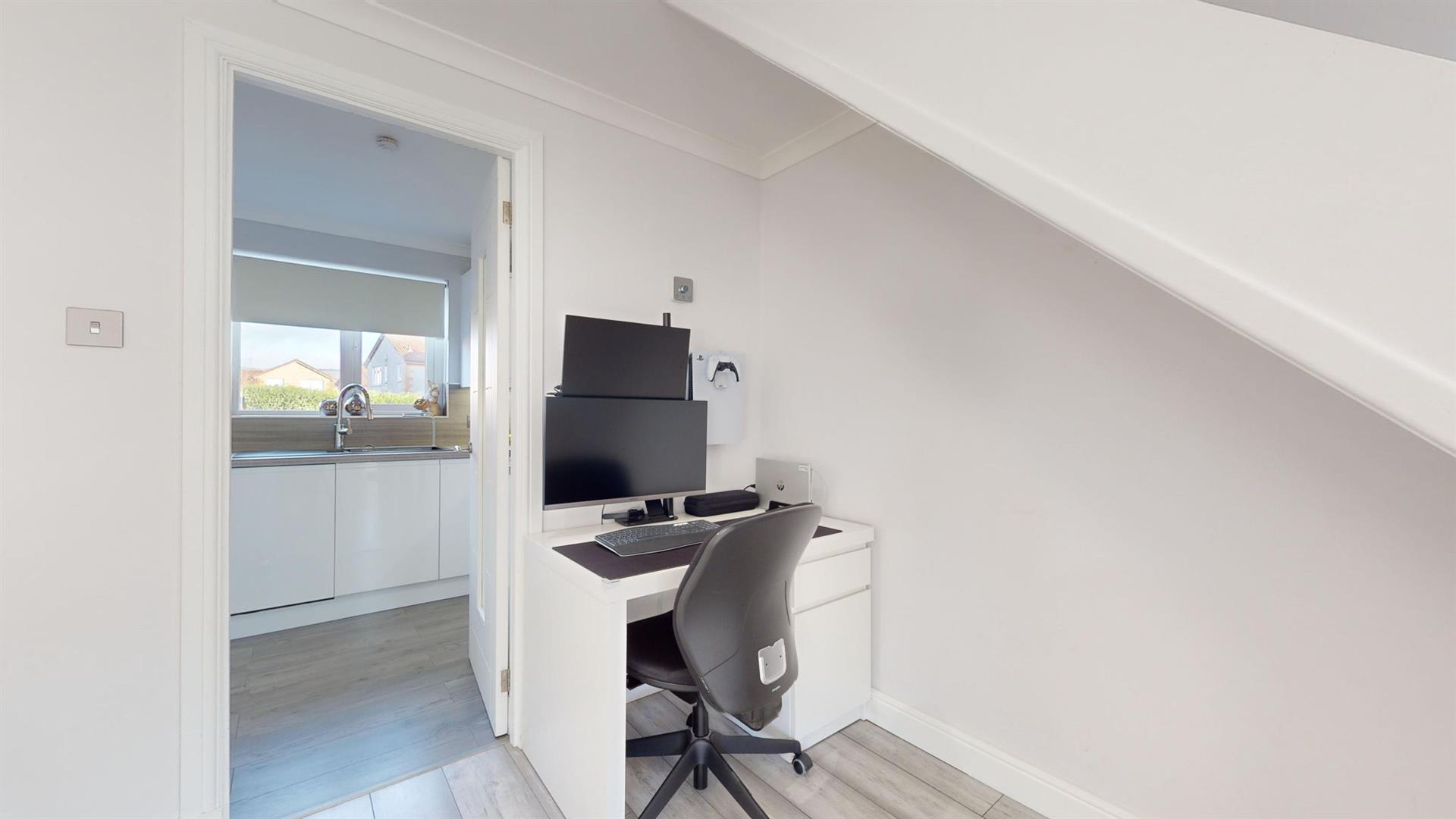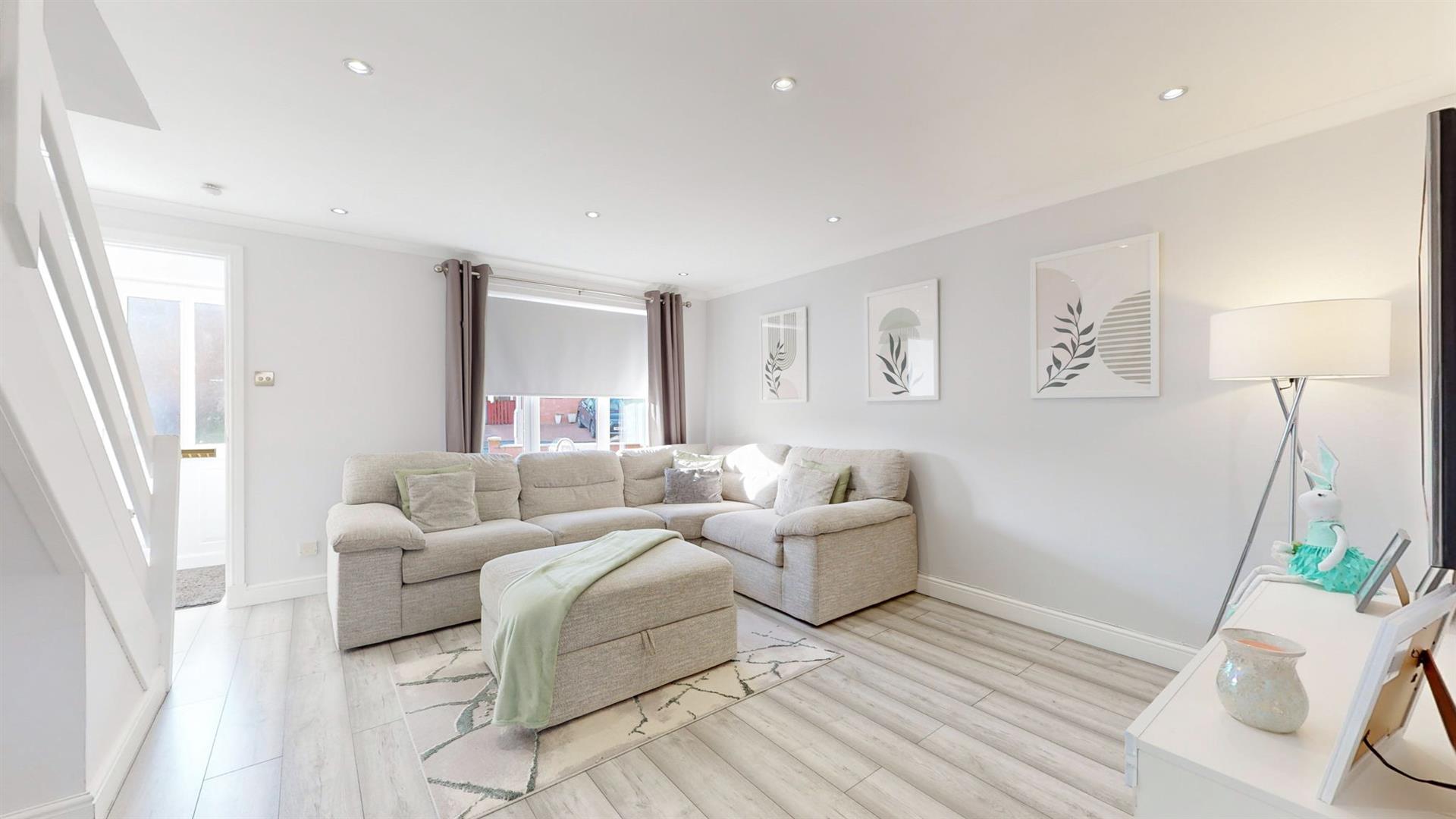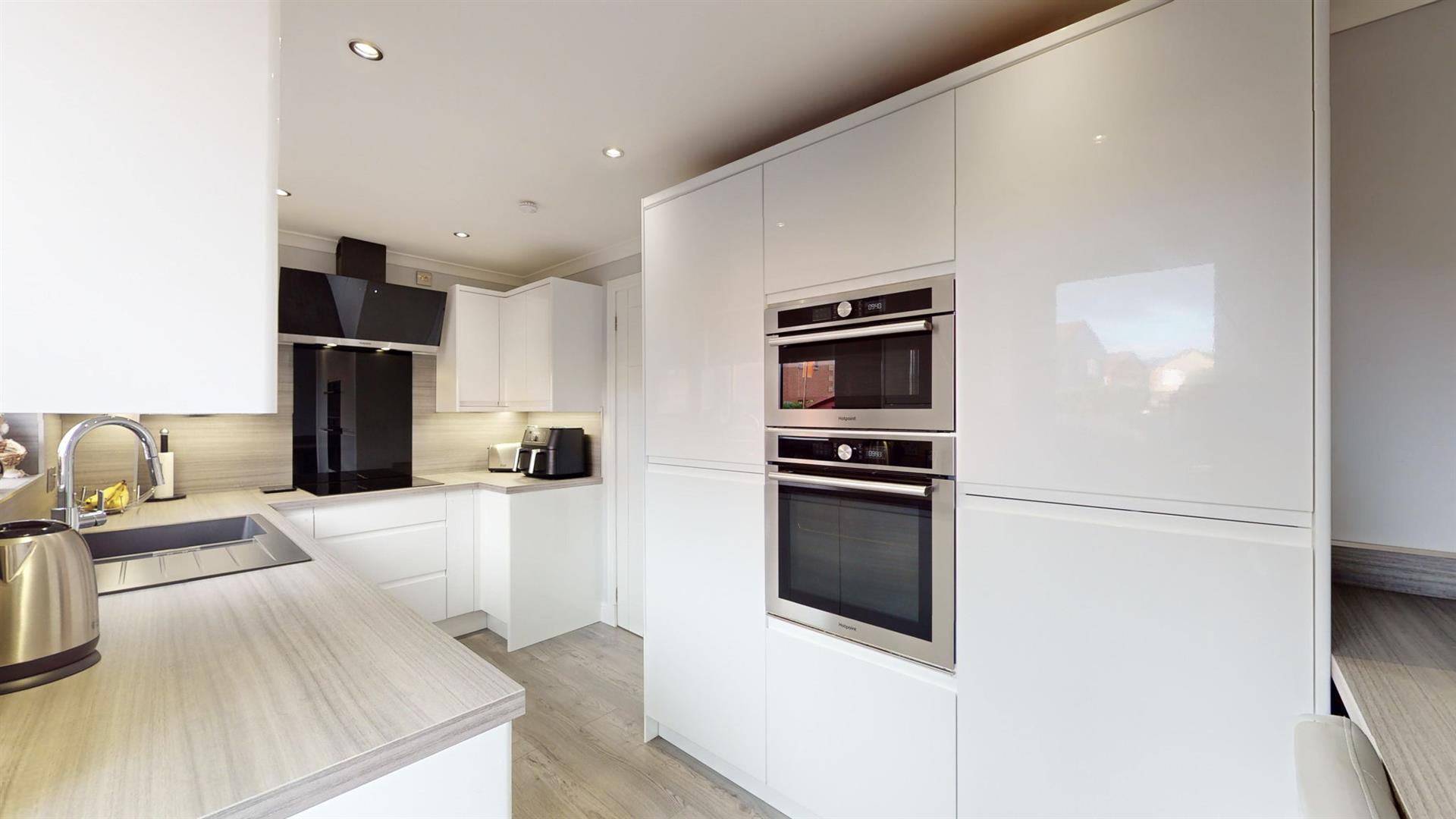 A driveway is available to the front of the property leading to the modern UPVC door. Upon entering, you are welcomed into an entrance vestibule with storage cupboard and then onto the neutrally decorated lounge. This relaxing space boasts a space for home working and large windows which flood this room with natural sunlight. The newly fitted kitchen is accessed to the rear of the lounge and benefits from an array of white gloss wall and base units and a convenient breakfast bar. With all appliances being integrated, the vendor has created a sleek and modern feel. Access to the rear garden, is via a modern UPVC door with a glass panel adding additional light to this bright room.