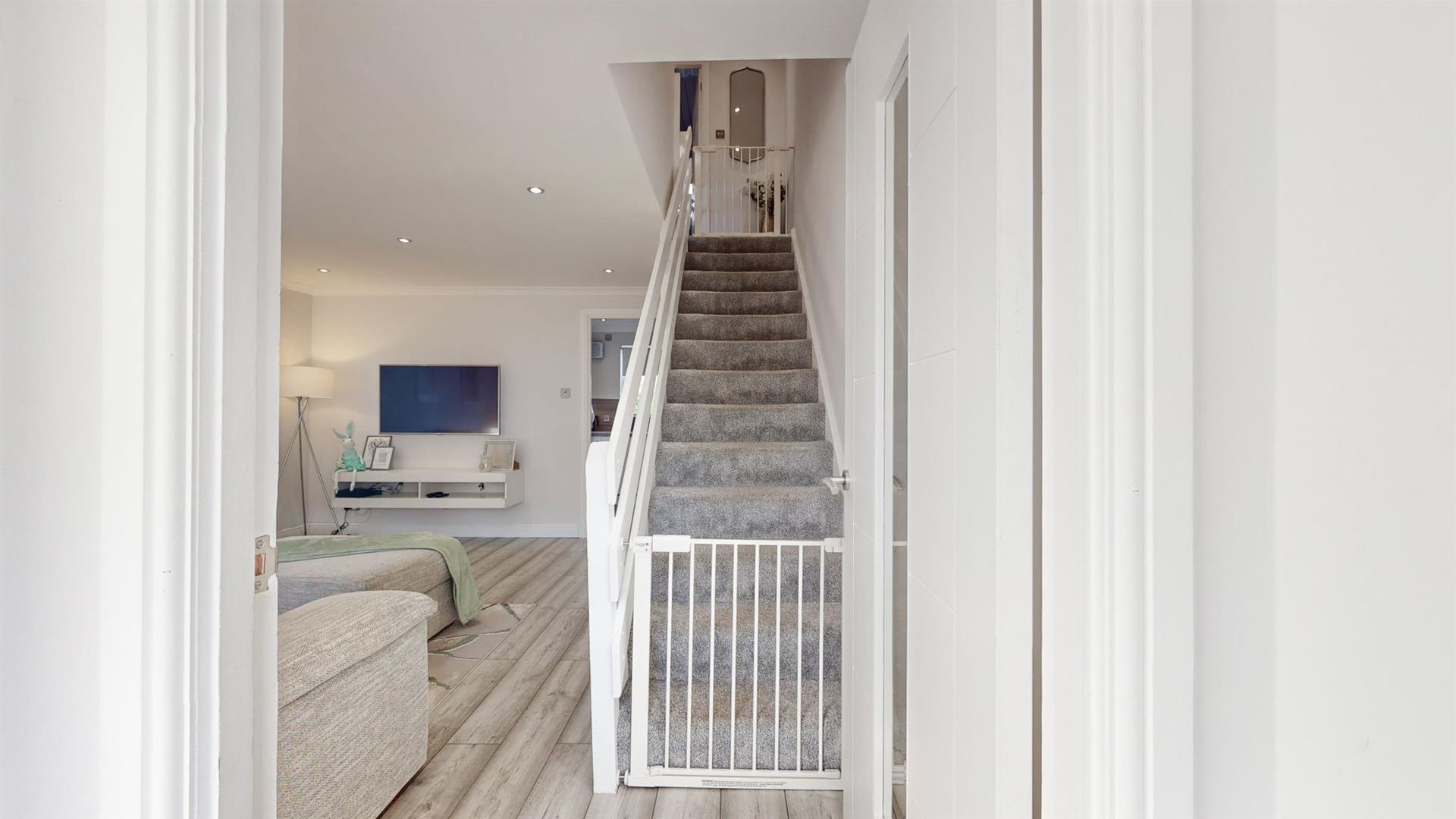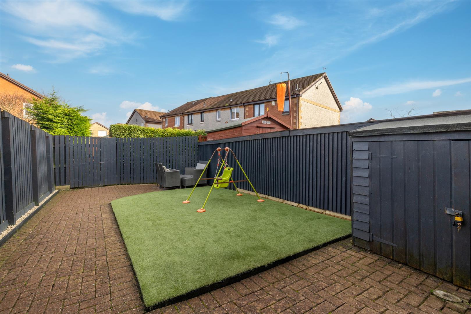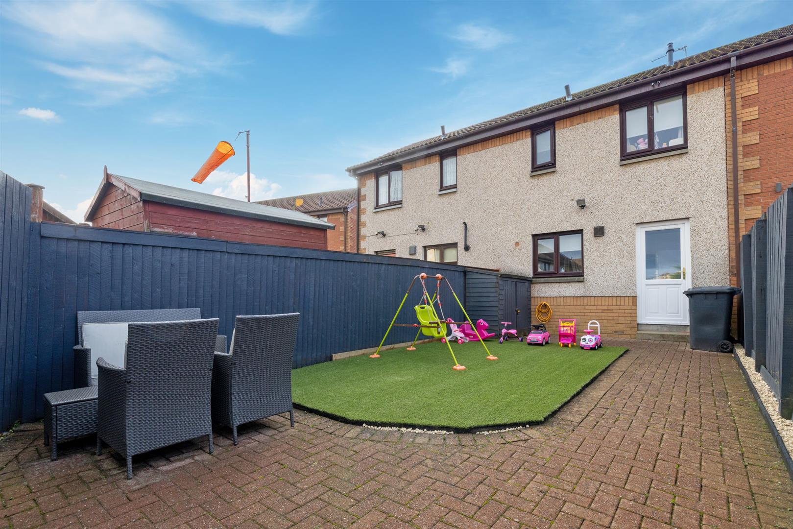 The rear garden is level and fully enclosed with patio and lawn area, creating a safe and easily maintained environment for children and pets alike.