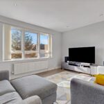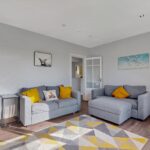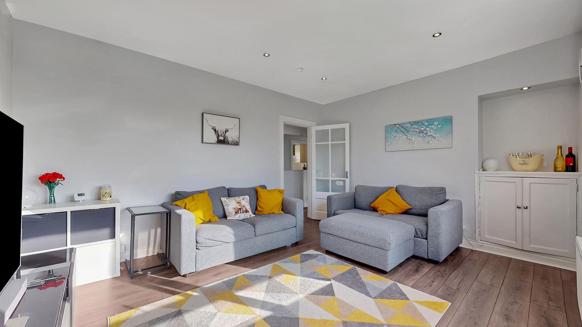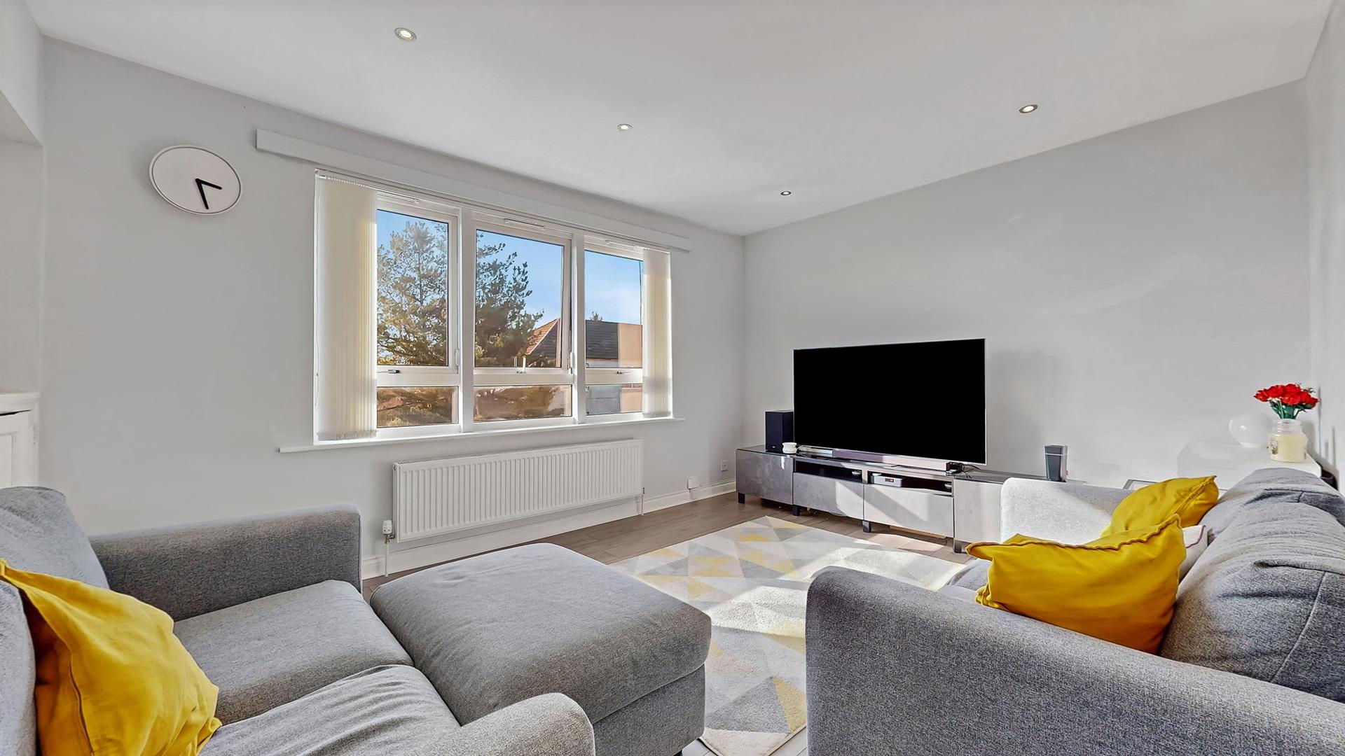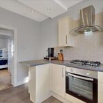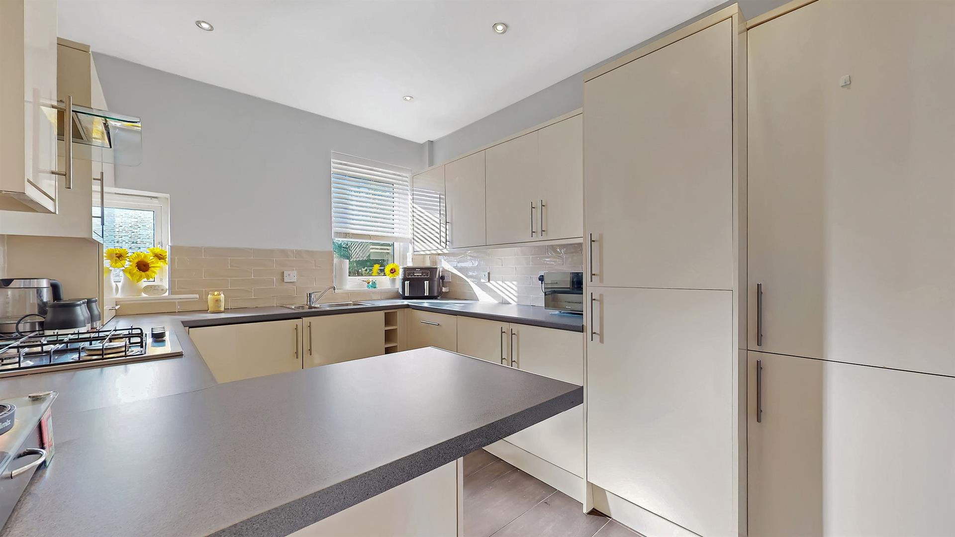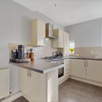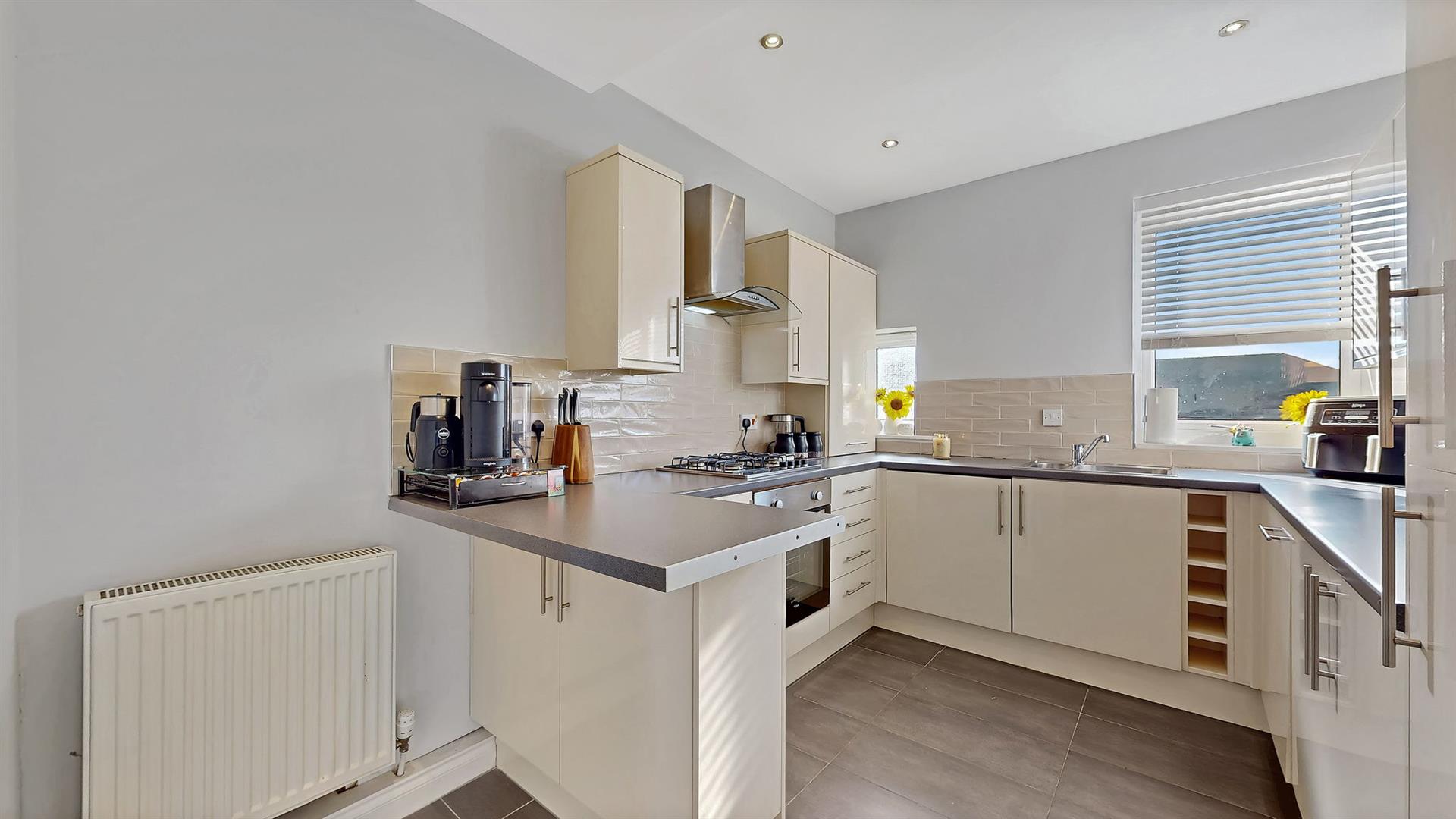 The lounge is bright and welcoming, enhanced by large windows that allow an abundance of natural light to fill the space. Finished in neutral décor, it provides a comfortable and versatile living area. The modern fitted kitchen features a range of wall and base-mounted units, offering excellent storage and generous worktop space. A breakfast bar adds a practical dining option, ideal for everyday use. The kitchen is further equipped with an integrated fridge/freezer, dishwasher, washing machine, gas hob, oven and extractor fan.