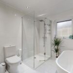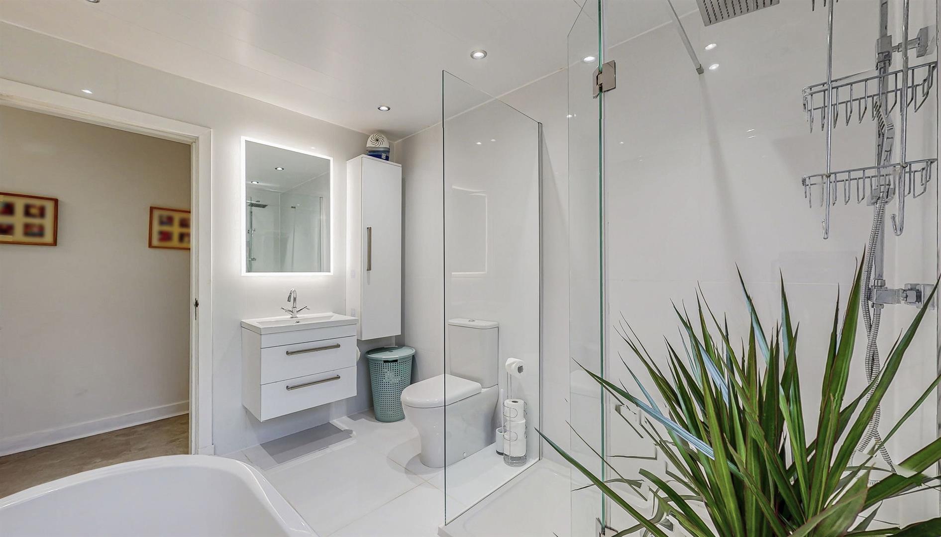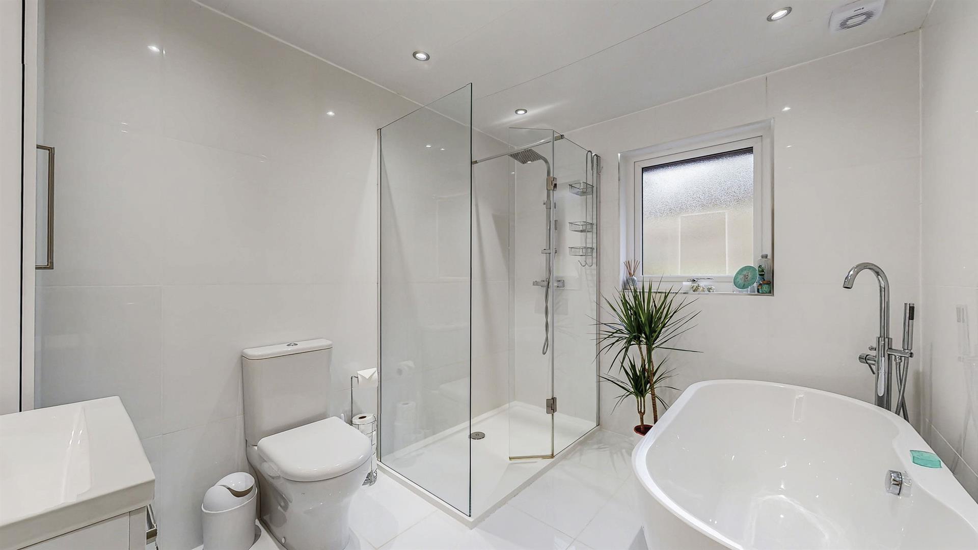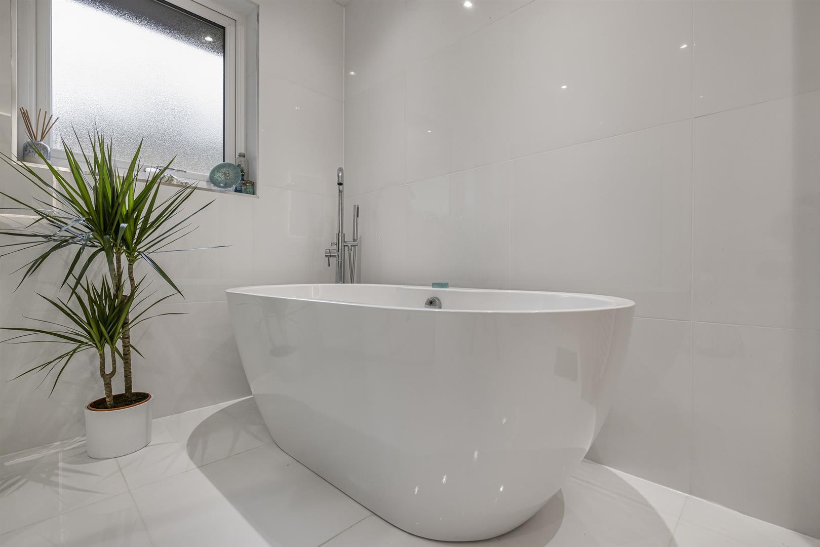 The family bathroom has been finished to a high standard, featuring contemporary tiling and quality fittings. A freestanding bath, separate rainfall shower, vanity unit and W.C. combine to create a stylish and relaxing space.