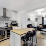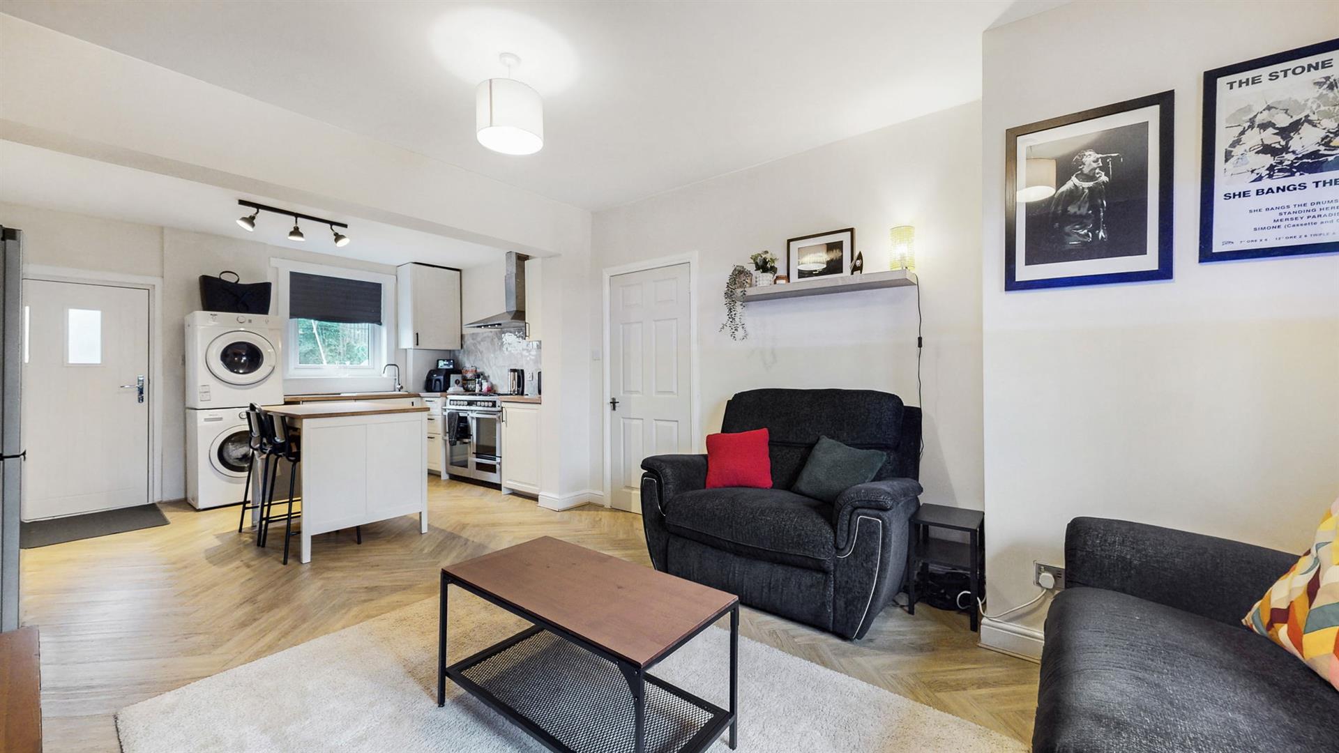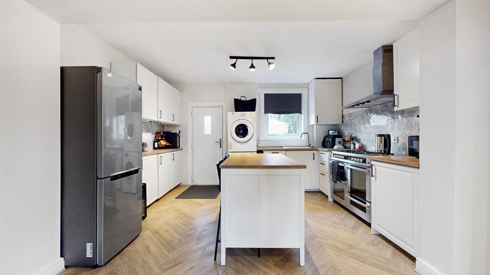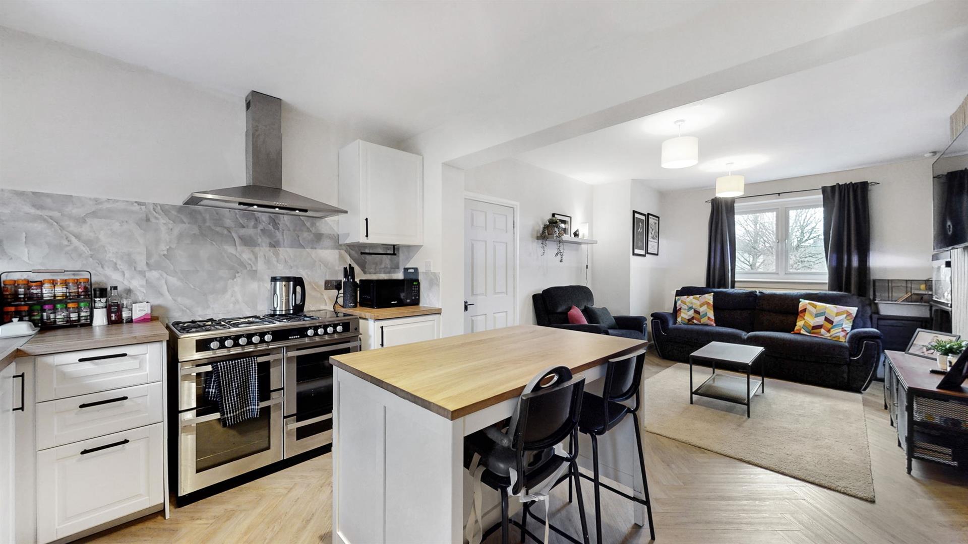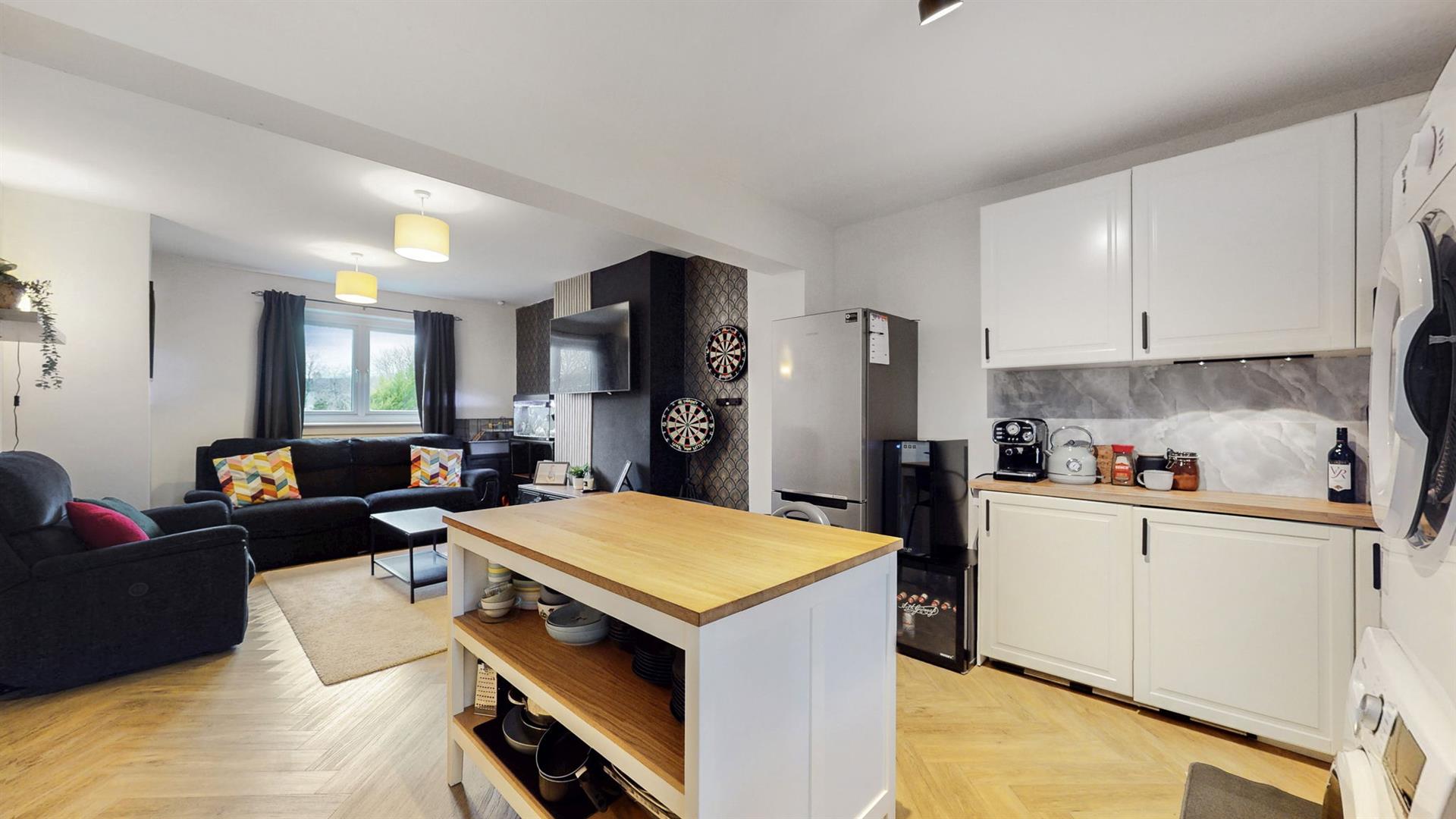 To the front of the property, ample on-street parking and a low maintenance lawn garden is available. Upon entering, you are welcomed into the bright reception hallway which leads to all rooms within this property. The open plan lounge and kitchen space is generous in size and boasts dual aspect windows and a glass panelled rear door, creating an abundance of natural light. The modern fitted kitchen hosts an array of white wall and floor units and wood effect worktops, creating a clean and efficient workspace. The kitchen further benefits from space for free-standing appliances, including a splendid range cooker. With the added benefit of a breakfast bar/island, this a lovely space for cooking, dining and entertaining.
