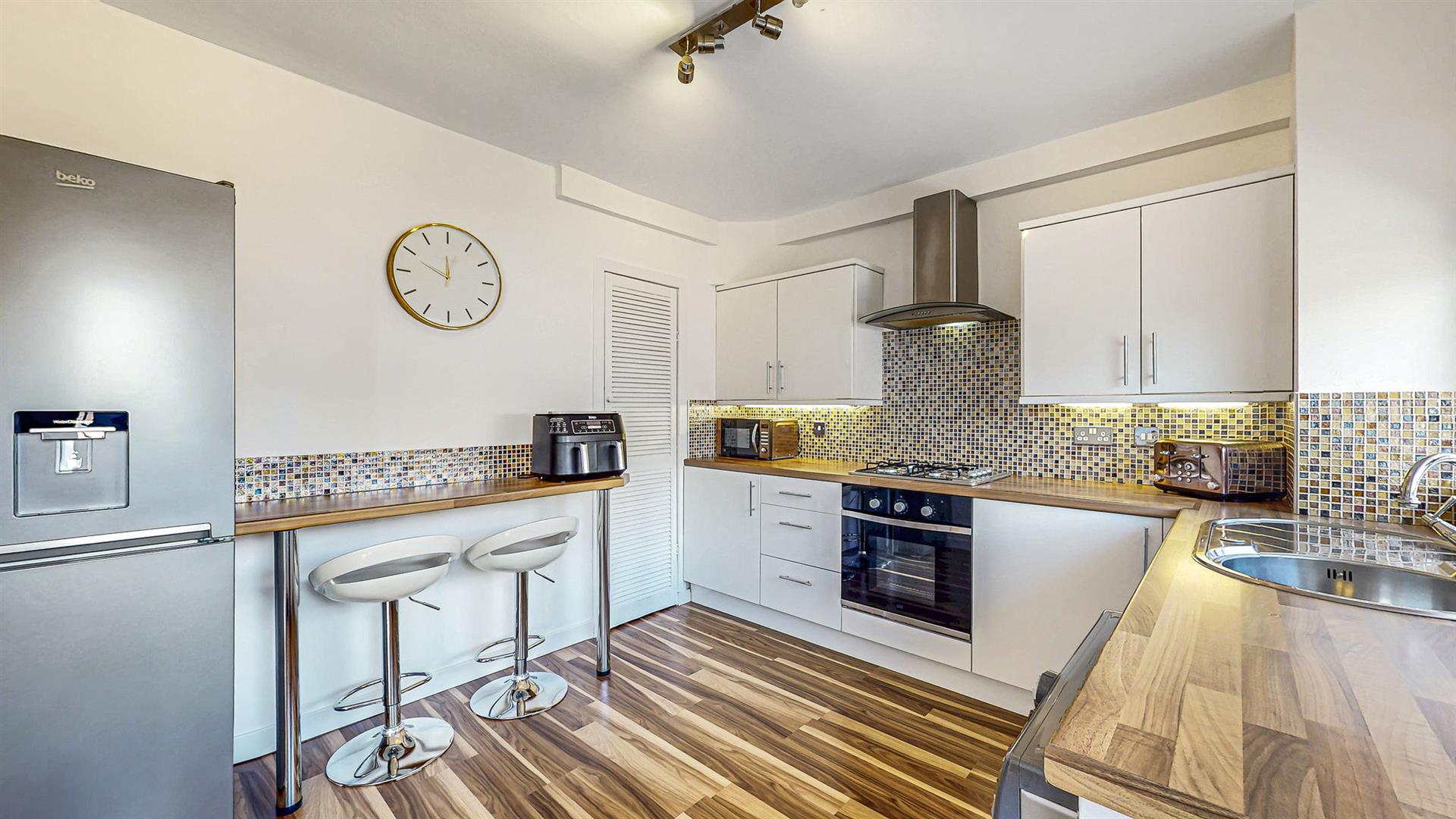 To the front of the property, a low maintenance garden is available. Upon entering through the modern uPVC door, you are welcomed into the reception hallway which leads you in the first instance to the spacious lounge. This relaxing space boasts a large window to the front and French door access to the rear garden which flood this space with natural sunlight. The splendid, fitted kitchen has an array of white wall and base units paired with a wood effect worktop, creating a fashionable and efficient workspace. The kitchen further benefits from a breakfast bar and an integrated gas hob, oven and extractor fan. Adequate space is available for a free-standing washing machine and fridge-freezer. Additional storage space is available within a full length cupboard to the rear of the kitchen. Direct access to the rear garden is also available via the kitchen. Completing this floor is a convenient cloakroom, comprising of a wash hand basin and W.C.