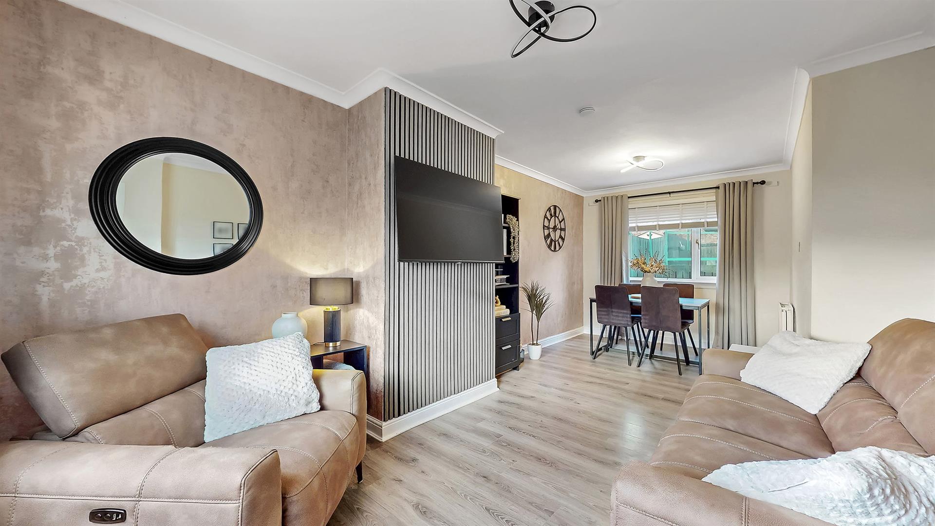 To the front of the property, there is ample on-street parking and a low maintenance lawn garden. Upon entering, you are welcomed into the bright reception hallway which leads to all rooms within this splendid property. The beautifully decorated open-plan lounge and dining area boasts a feature wall and dual aspect windows providing an abundance of natural light.