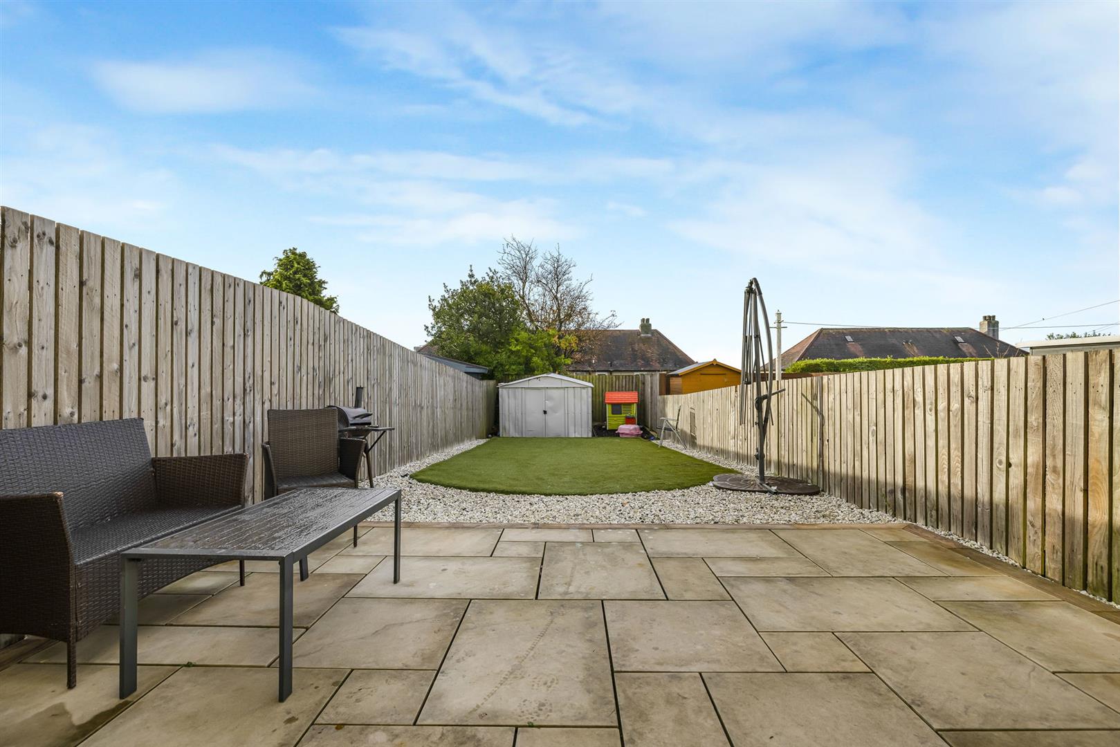 The fully enclosed rear garden is accessed via the kitchen and has been recently landscaped. Designed to be low maintenance with areas of patio and artificial lawn creating a safe environment for children and pets alike. A large shed is conveniently available to the bottom of the garden, perfect for storing garden furniture and equipment.