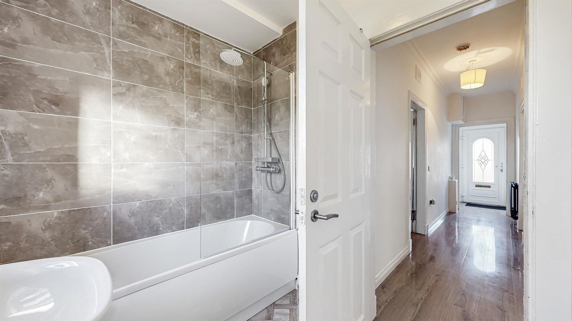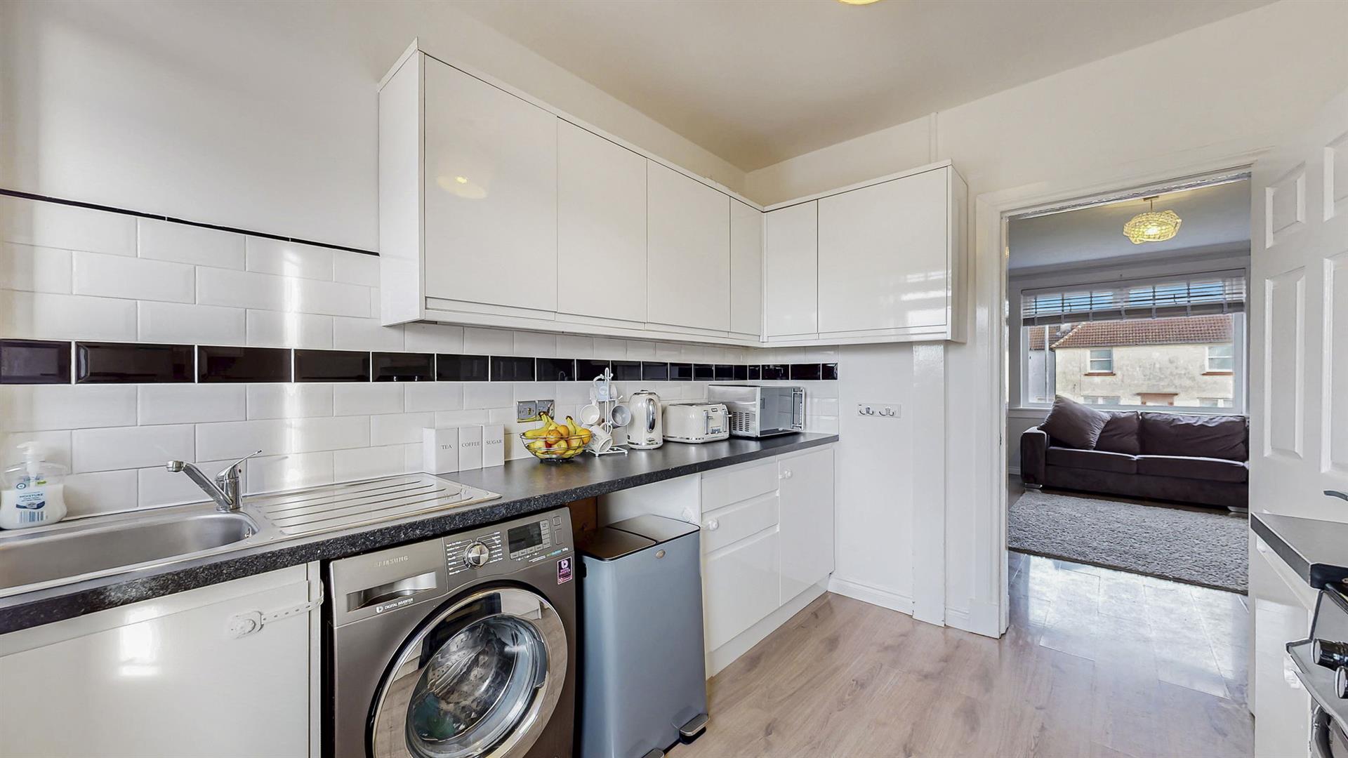 To the front, the property benefits from on-street parking and a substantial lawn garden. There is adequate space available for a driveway at the bottom of the garden (subject to required permissions). Upon entering through the modern composite door, the welcoming hallway benefits from a large storage cupboard and leads to most rooms within this property. The neutrally decorated lounge boasts large windows filling this space with natural sunlight and provides access into the modern fitted kitchen. The kitchen has an array of white wall and base mounted units paired with contrasting worktops, creating a clean and efficient workspace. Space is available for a free-standing cooker, fridge-freezer and washing machine. Both bedrooms within this property are generous in size and boast fitted storage. Completing this property is a splendid partially tiled family bathroom which comprises of a rainfall shower over bath, wash hand basin and W.C.