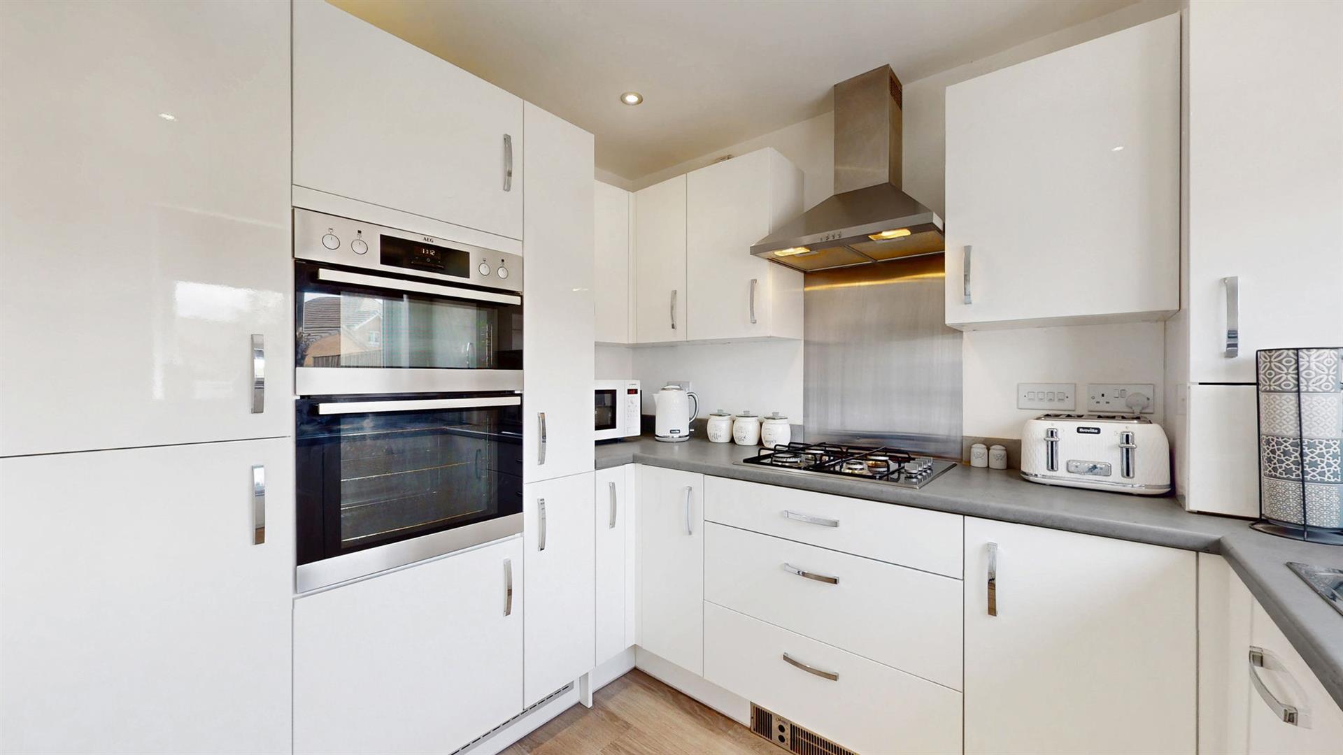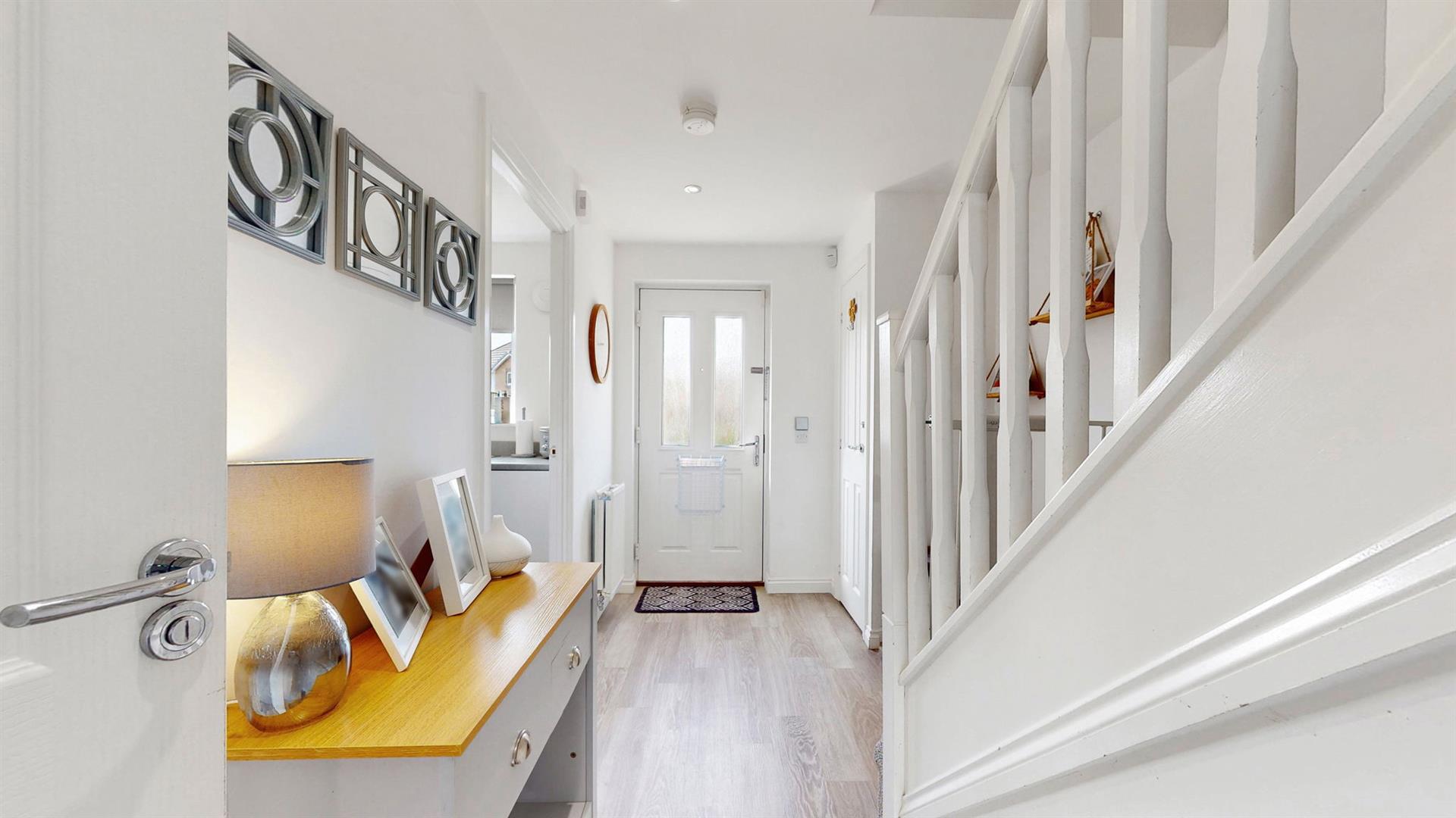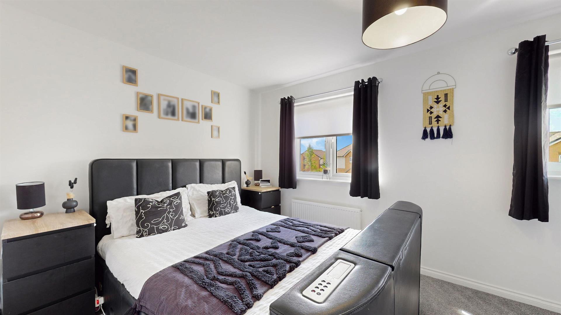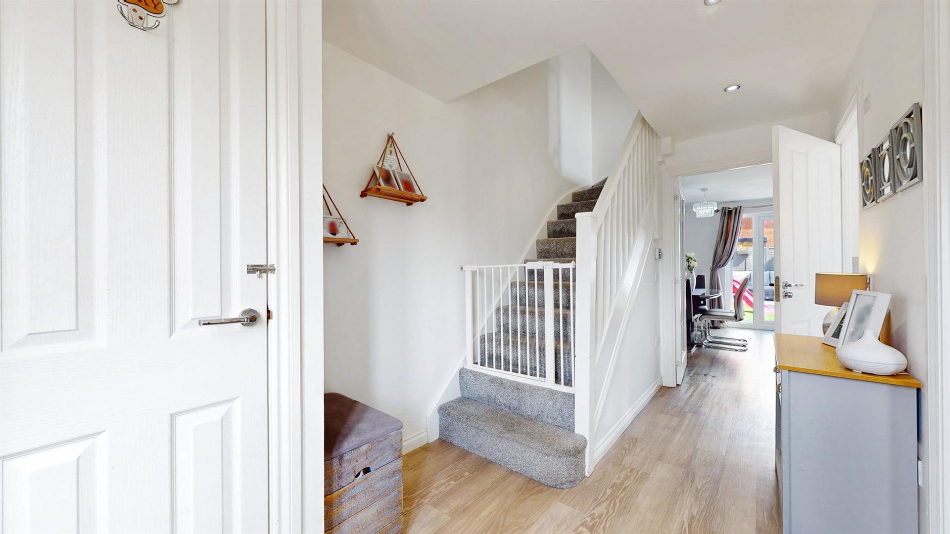 Externally, the property benefits from two allocated parking spaces, soffit lighting to the front and rear of property and a splendid rear garden. Upon entering, through the modern uPVC door, you are welcomed into the bright and airy reception hallway which leads you to all rooms and benefits from a storage cupboard to the side of the front door. The neutrally decorated lounge area boasts space for dining and french door access to the rear garden which flood this space with natural sunlight. A cleverly located storage cupboard going under the stairway is also available to the side of the lounge. The modern fitted kitchen benefits from an array of white gloss base and wall units and complementary worktops, creating a modern and efficient space. The kitchen has the further advantage of an integrated gas hob, double oven, extractor fan, washing machine, dishwasher and fridge freezer. Completing this floor, is a convenient cloakroom with W.C. and wash hand basin.